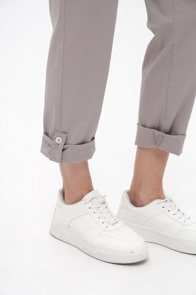 Брюки имеют прямой крой, пояс на резинке и завязках, а также манжеты на пуговицах, что позволяет регулировать длину. Цвет брюк – серый, что делает их универсальными и легко сочетаемыми с различными элементами одежды.