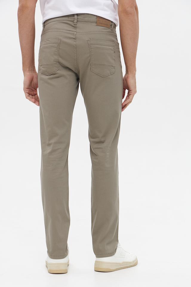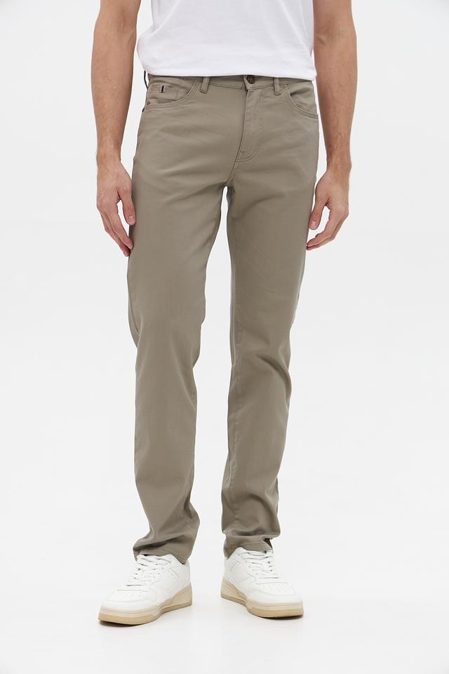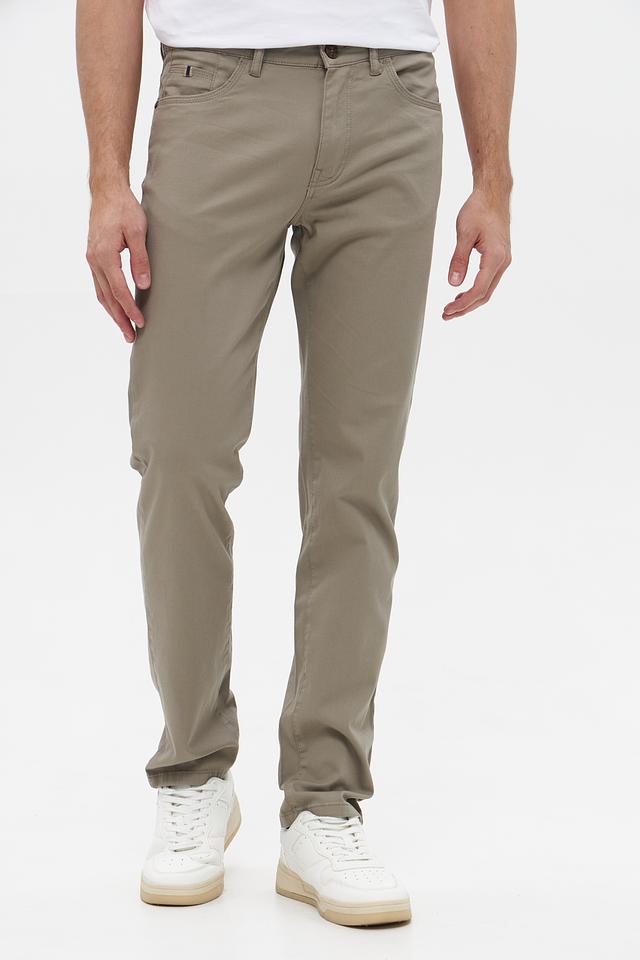 Брюки имеют прямой крой, классическую посадку и стандартную длину. Цвет хаки делает их универсальными и легко сочетаемыми с различными элементами гардероба. Классический пояс с петлями для ремня и функциональные карманы добавляют практичности.