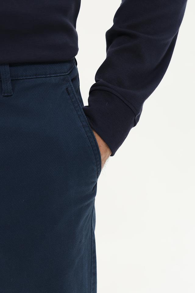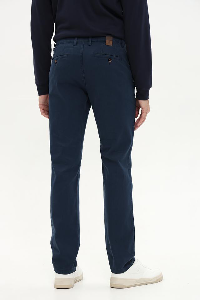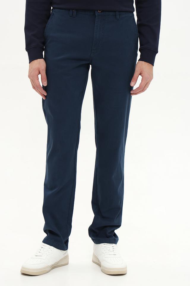 Цвет брюк – насыщенный темно-синий, который легко сочетается с различными элементами гардероба. Застежка на молнию и пуговицу, а также наличие задних карманов на пуговицах добавляют функциональности и стиля. Состав: хлопок 97%, эластан 3%.