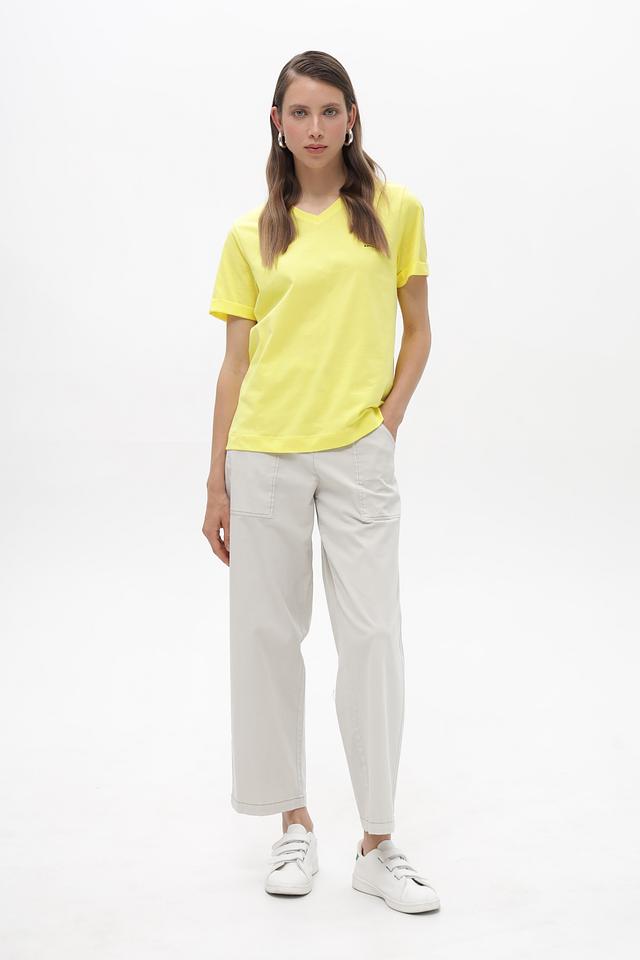 Брюки имеют свободный крой, обеспечивающий комфорт в движении, а также среднюю посадку. Застежка на пуговицы подчеркивает лаконичный дизайн.