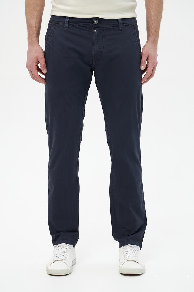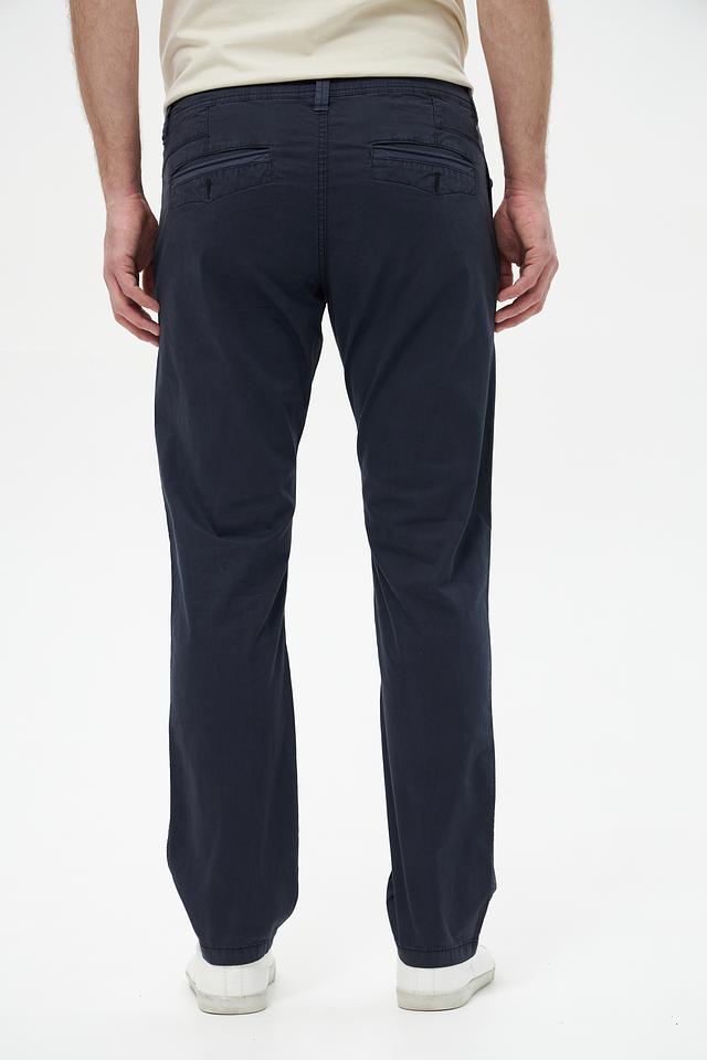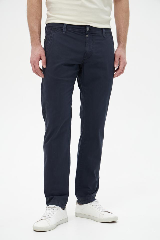 Цвет брюк – насыщенный темно-синий, который легко сочетается с различными элементами гардероба. Модель оснащена стандартным набором карманов: двумя боковыми и двумя задними. Застежка – молния и пуговица. Состав: 97% хлопок, 3% эластан.