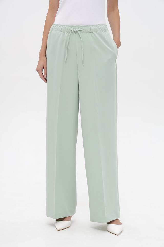 Брюки имеют широкий крой, который обеспечивает свободу движений и создает элегантный силуэт. Удобная посадка на талии с эластичной резинкой и завязками позволяет регулировать облегание по фигуре. Боковые карманы добавляют функциональности.