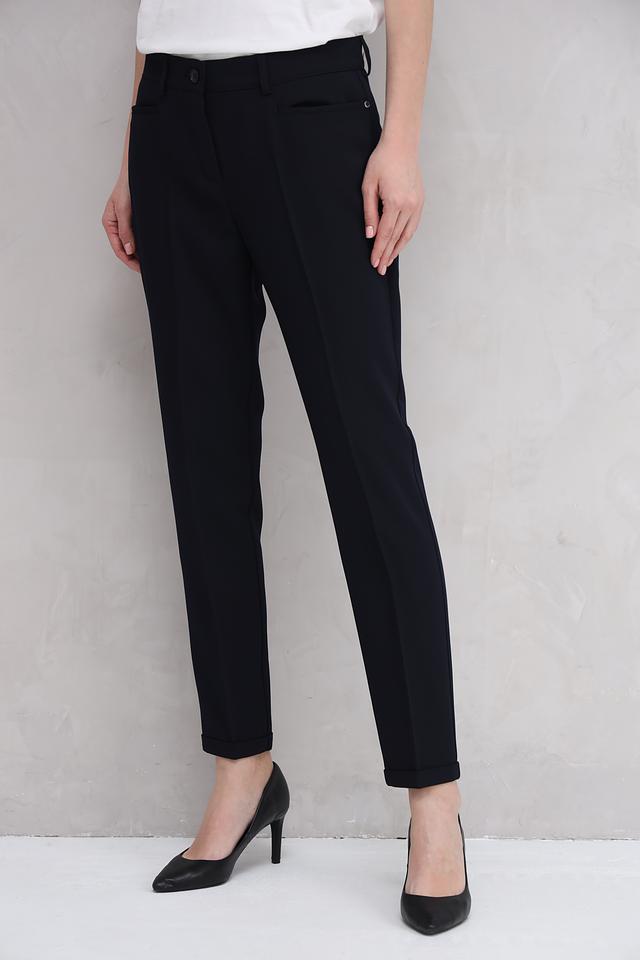 Брюки имеют прямой крой, обеспечивающий комфортную посадку по фигуре. Высокая посадка визуально удлиняет ноги и подчеркивает талию. Застежка на молнию и пуговицу гарантирует надежную фиксацию. Модель дополнена боковыми карманами.