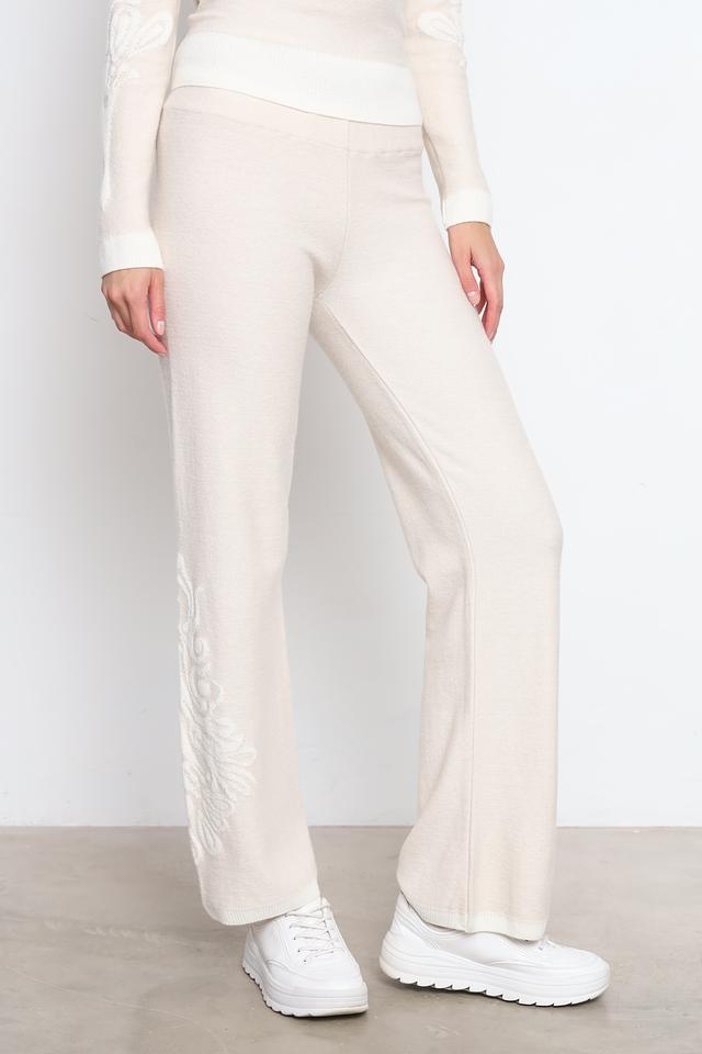 Особенностью данной модели является декоративный вязаный узор, расположенный по боковой части брюк, что придает им изысканность и оригинальность. Прямой крой и высокая посадка подчеркивают фигуру и обеспечивают свободу движений. Брюки идеально подойдут для создания как повседневных, так и более нарядных образов.