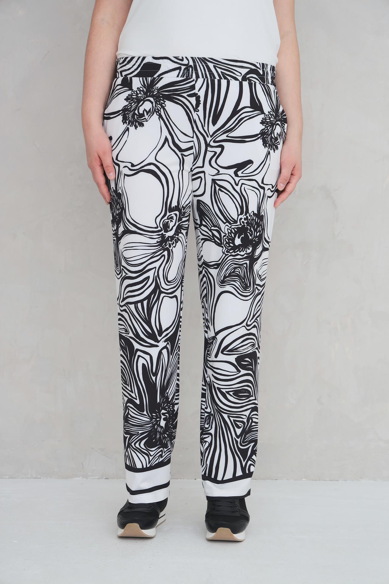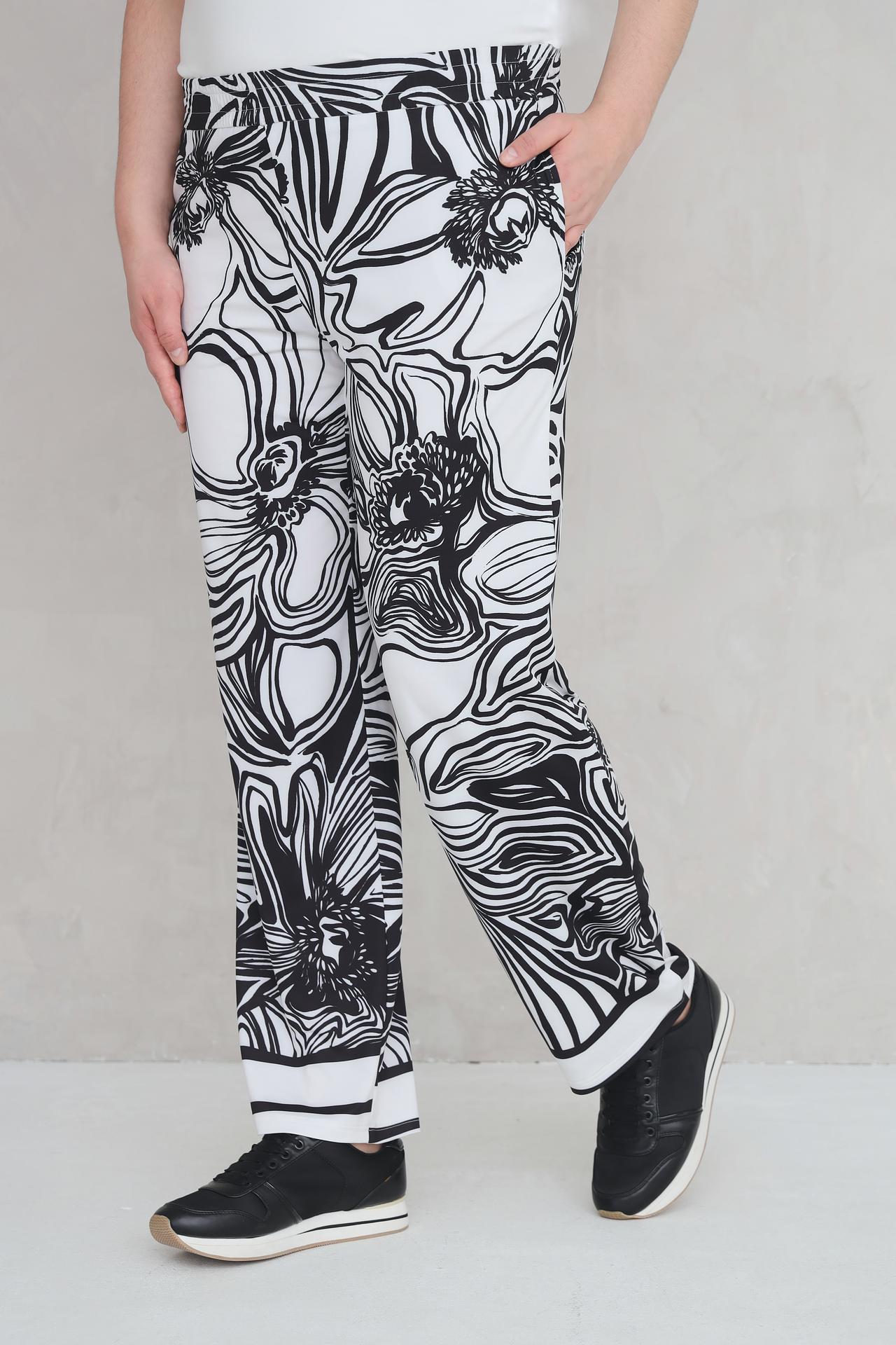 - Оригинальный принт. Яркий и выразительный черно-белый абстрактный цветочный узор привлекает внимание, делая брюки центральным элементом образа. Это идеальный выбор для тех, кто ценит уникальность и современный стиль.
