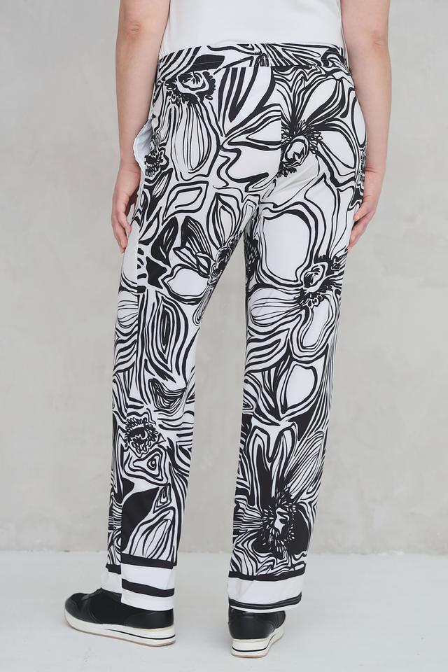 Брюки выполнены в контрастном чёрно-белом цвете и украшены эффектным цветочным принтом, который придает им особый шарм и индивидуальность. Принт выполнен в виде абстрактных цветочных мотивов, создающих динамичный и современный образ.