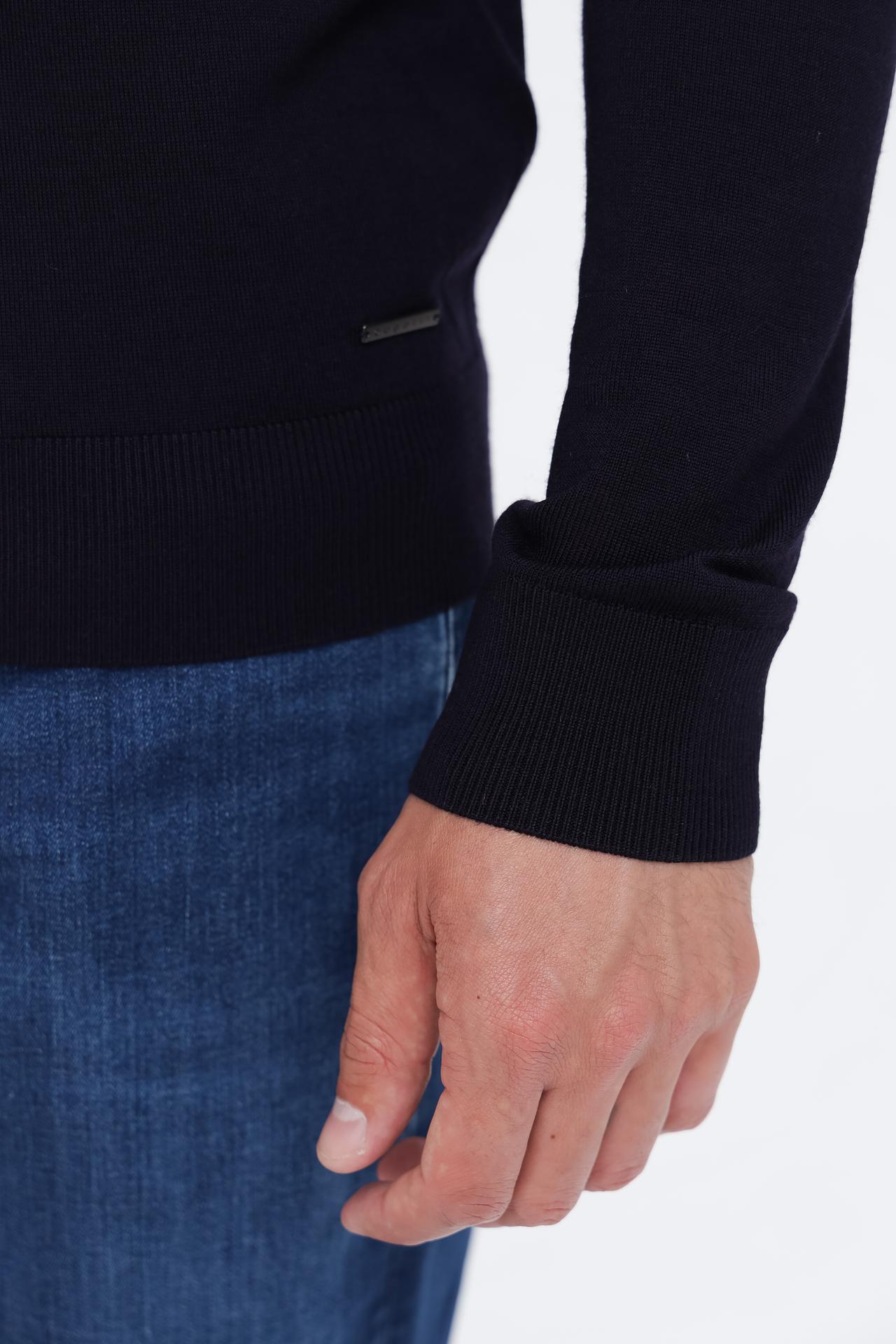 Базовый темно-синий цвет и минималистичный дизайн делают этот пуловер универсальным выбором для любого случая – от деловых встреч до повседневных прогулок. На манжете расположен декоративный элемент – небольшая фирменная планка с логотипом Bugatti, придающая изделию особый шарм.