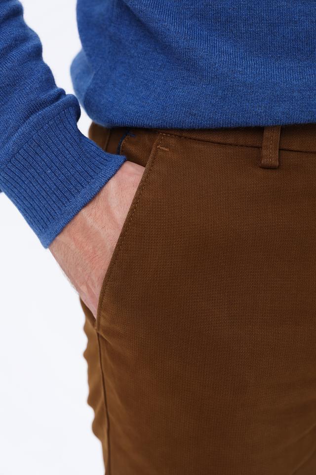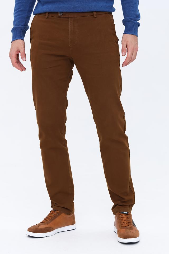 Брюки выполнены из высококачественного хлопка с добавлением эластана, что придает им мягкость, эластичность и устойчивость к сминанию. Коричневый цвет делает их универсальным элементом гардероба, который легко сочетается с различными видами верхней одежды и обуви.