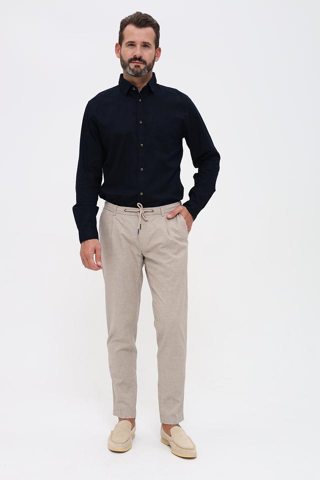 Мужские брюки Bugatti бежевого цвета с удобными завязками на поясе. Модель выполнена из смесовой ткани с добавлением хлопка и льна, что обеспечивает комфорт и воздухопроницаемость. Состав: хлопок 56%, лен 42%, эластан 2%