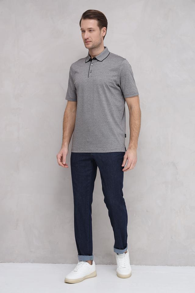 Воротник и планка поло оформлены чёрной полоской, что добавляет изделию элегантности и стиля. Застёжка состоит из трёх пуговиц в тон планки. Короткие рукава обеспечивают свободу движений.