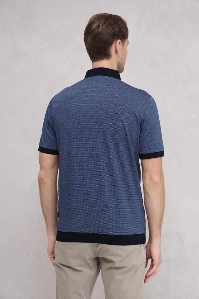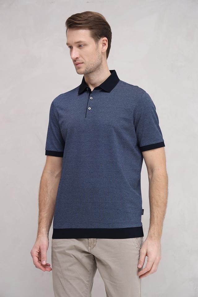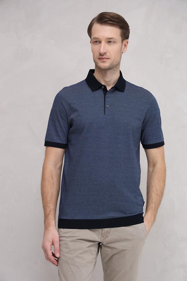 Мужское поло Bugatti синего цвета с геометрическим узором и черной отделкой. Классический крой и 100% хлопковый состав обеспечивают комфорт и удобство в носке. Состав: хлопок 100%