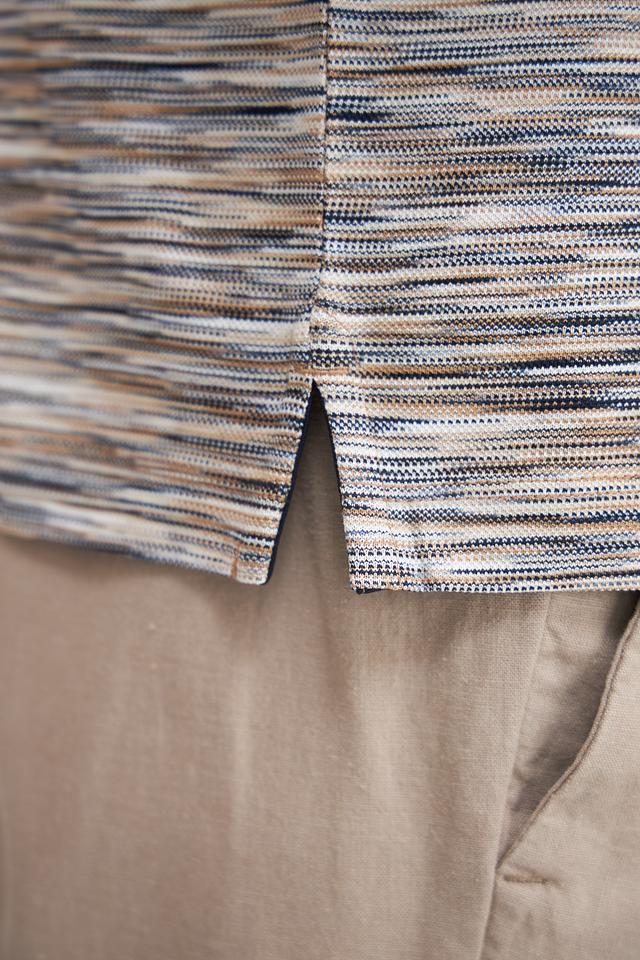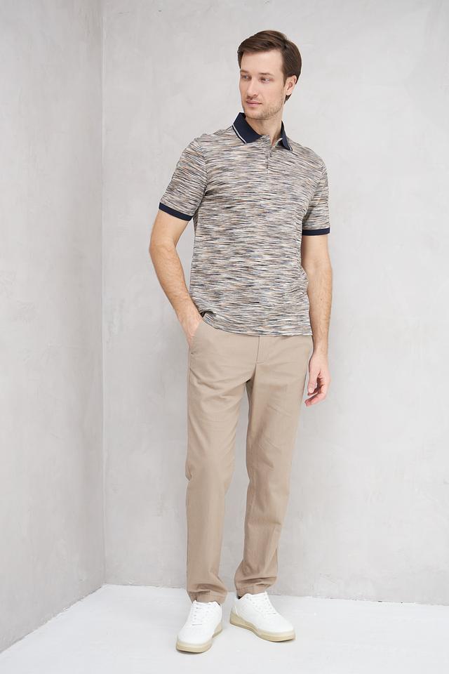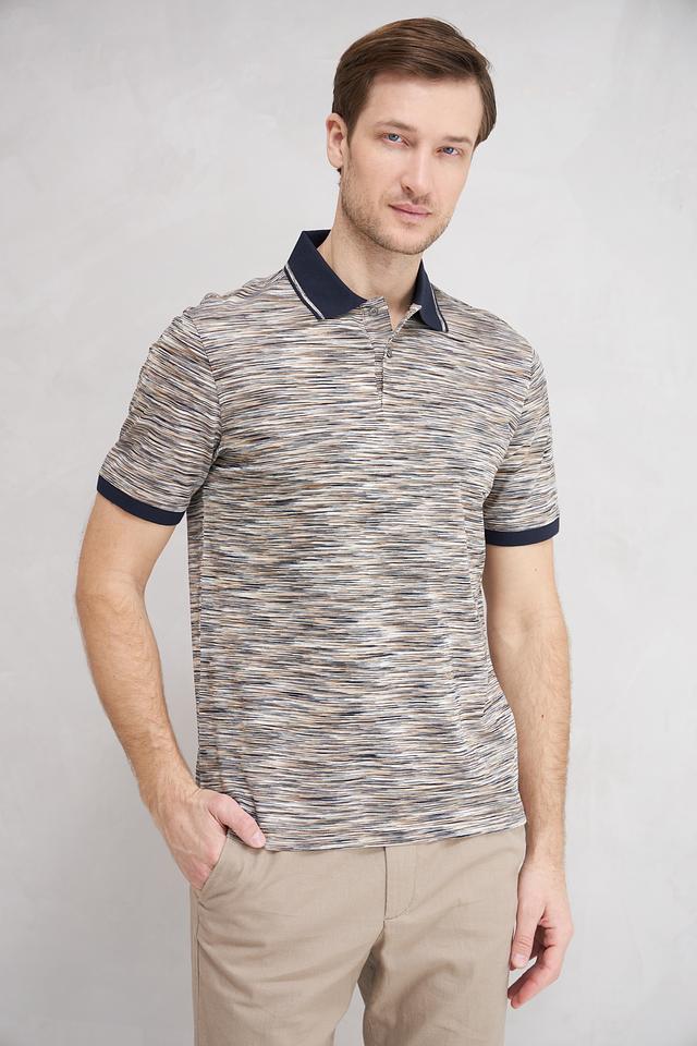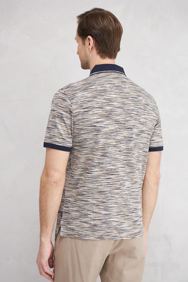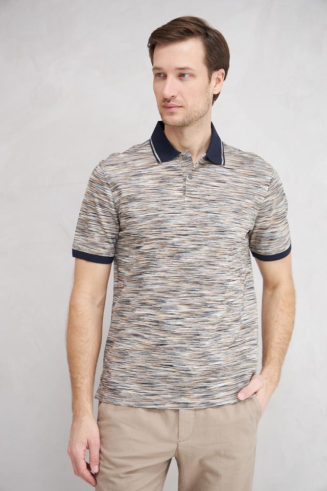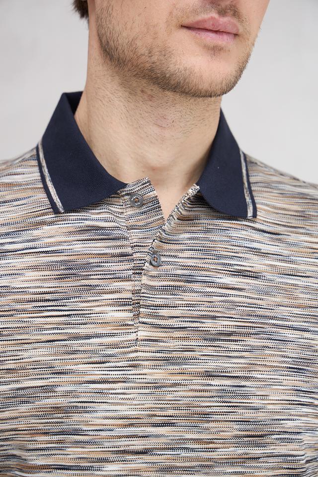 Поло выполнено в сером цвете с оригинальным полосатым рисунком, который придает ему современный вид. Тёмно-синий воротник и манжеты контрастно выделяются на фоне основного полотна, добавляя образу выразительности.