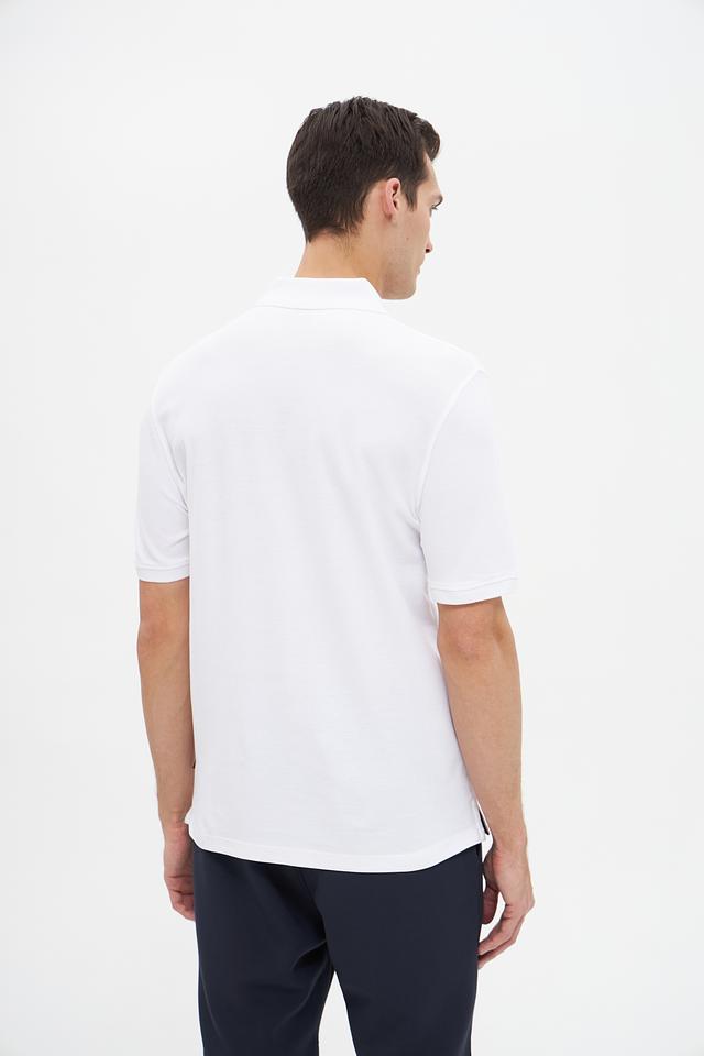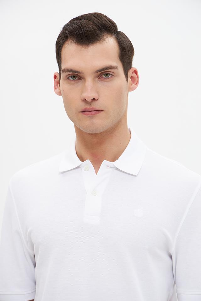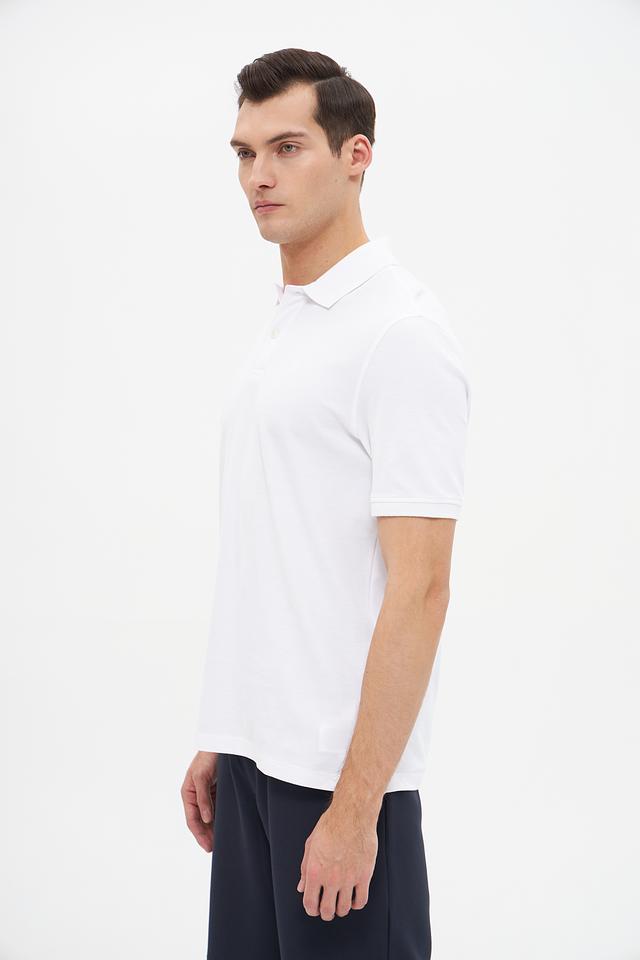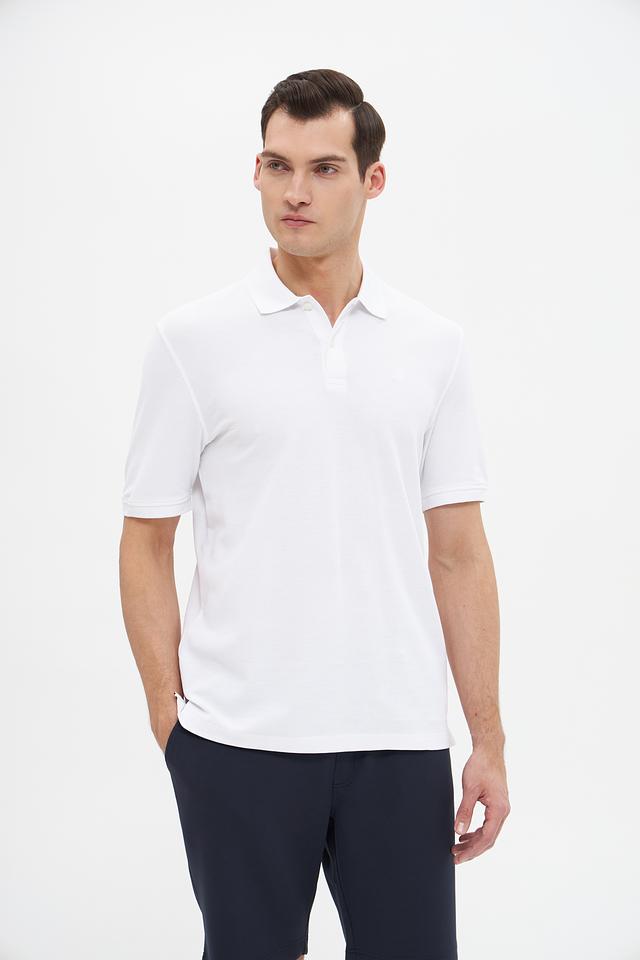 Мужское поло от Bugatti выполнено в классическом белом цвете. Изделие имеет прямой крой, короткие рукава и традиционный воротник-поло с планкой на пуговицах.