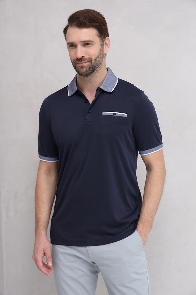 Мужское поло от Bugatti выполнено в классическом стиле с акцентом на детали. Основной цвет – темно-синий, который отлично сочетается с серым воротником и манжетами, создавая стильный контраст.