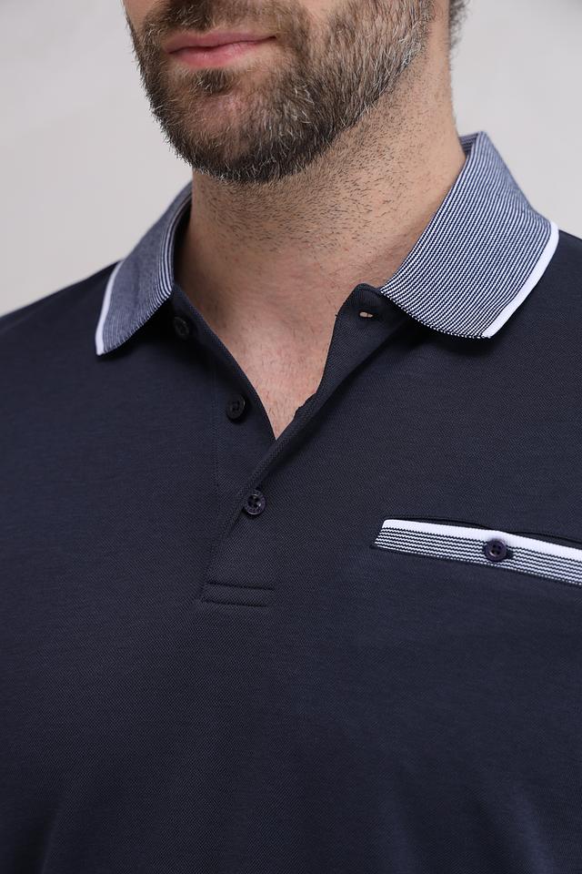 Мужское поло Bugatti темно-синего цвета с контрастным серым воротником и отделкой. Изготовлено из сочетания хлопка и полиэстера, обеспечивающего комфорт и практичность. Состав: полиэстер 50%, хлопок 50%