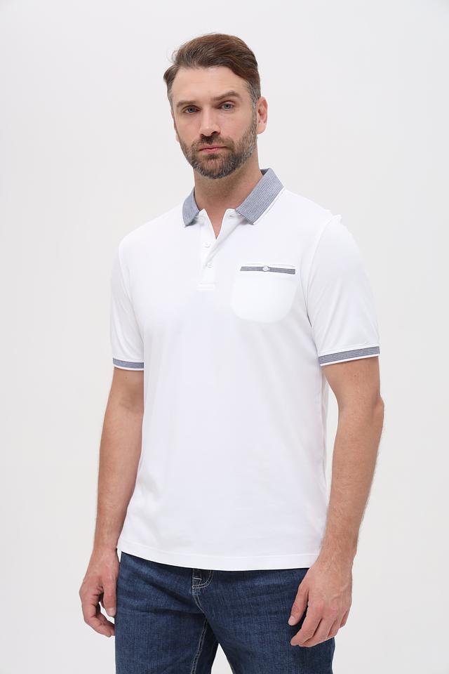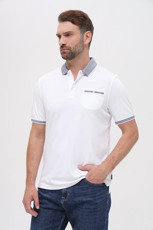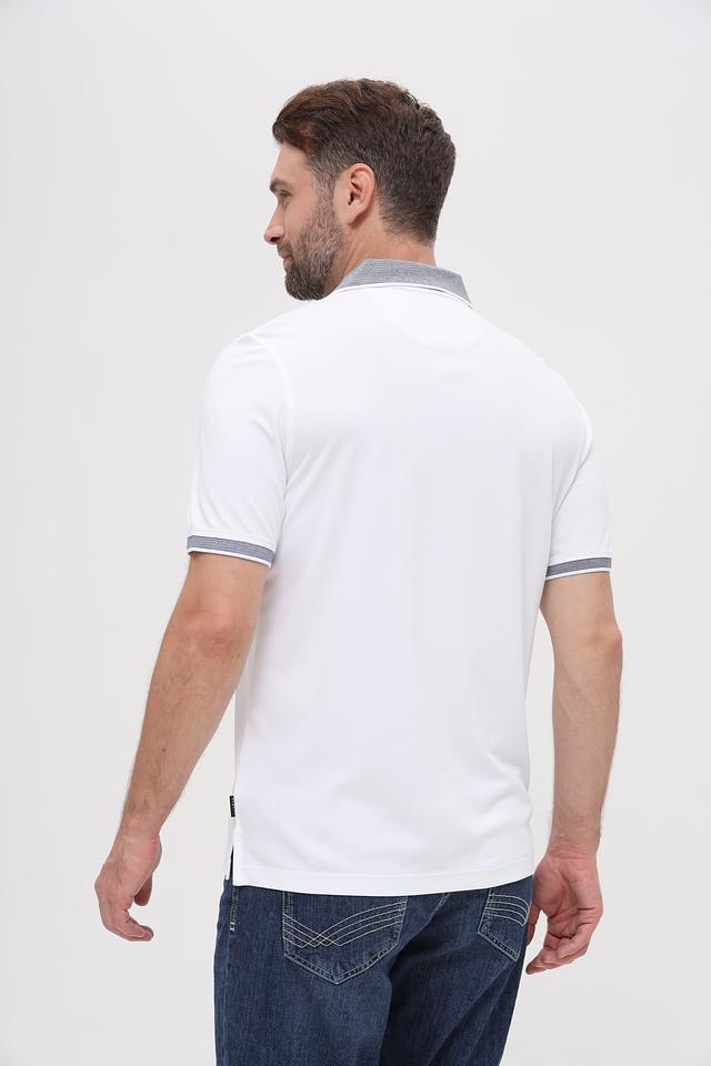 Белое поло Bugatti с контрастной полоской на воротнике и груди — стильное и комфортное решение для повседневного образа. Изготовлено из сочетания хлопка и полиэстера, обеспечивающего удобство и практичность. Состав: полиэстер 50%, хлопок 50%