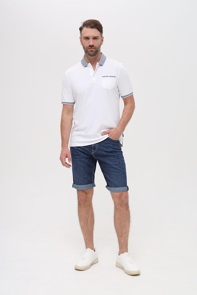 Воротник и планка поло отделаны полоской в сине-серую клетку, что придает изделию особый шарм. На груди расположена небольшая полоска в тон воротнику. Поло выполнено из высококачественного материала – сочетания 50% хлопка и 50% полиэстера, что обеспечивает приятные тактильные ощущения и простоту в уходе.