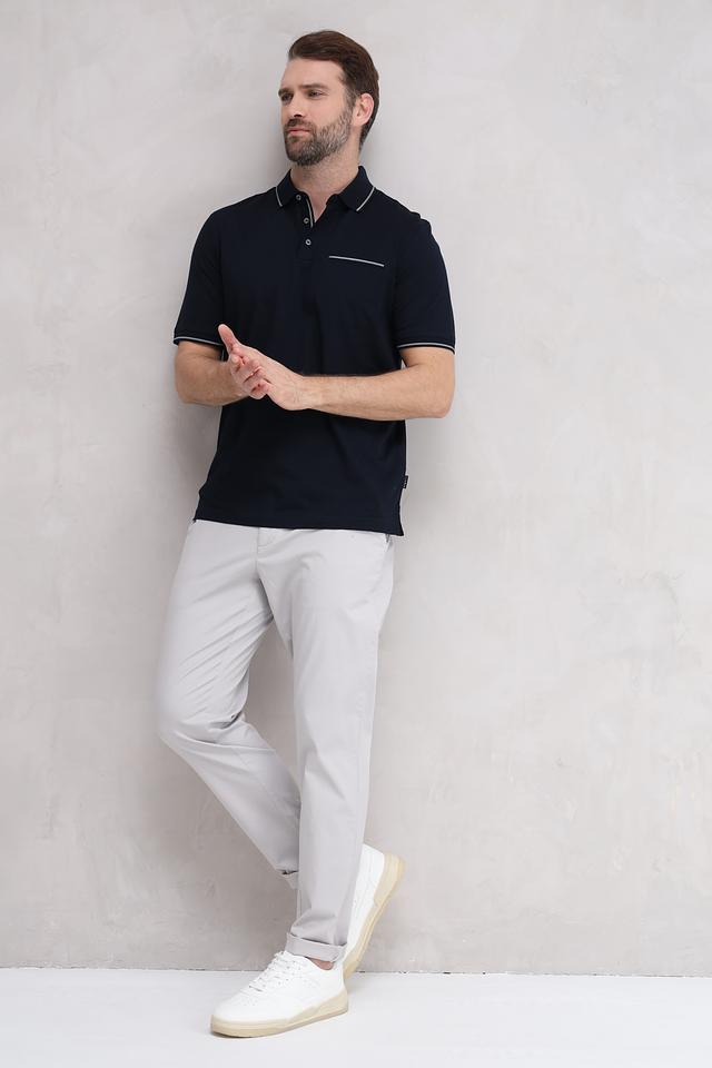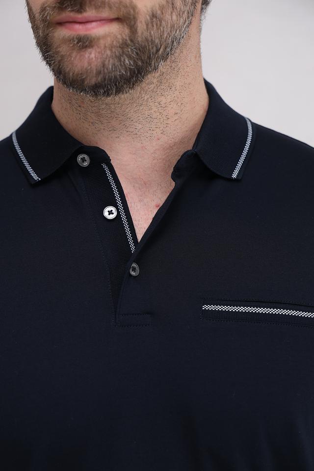 Мужское поло Bugatti темно-синего цвета с контрастной отделкой на воротнике и рукавах. Изготовлено из 100% хлопка, обеспечивающего комфорт и воздухопроницаемость. Состав: хлопок 100%
