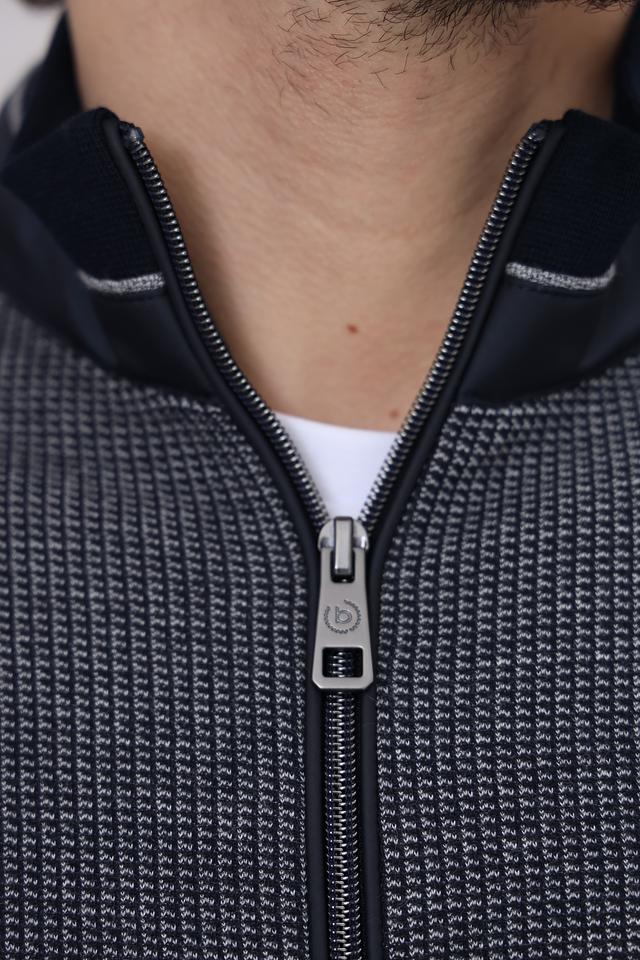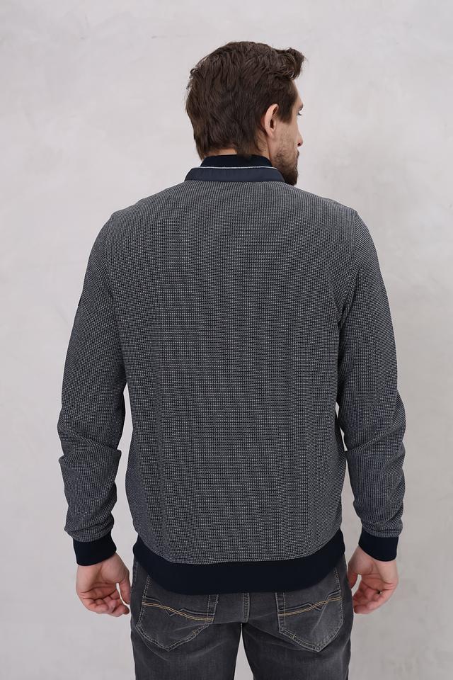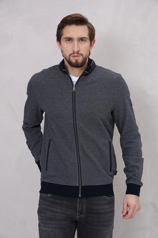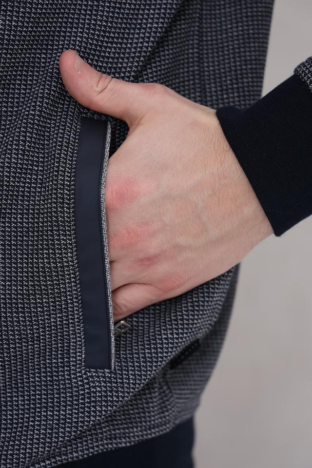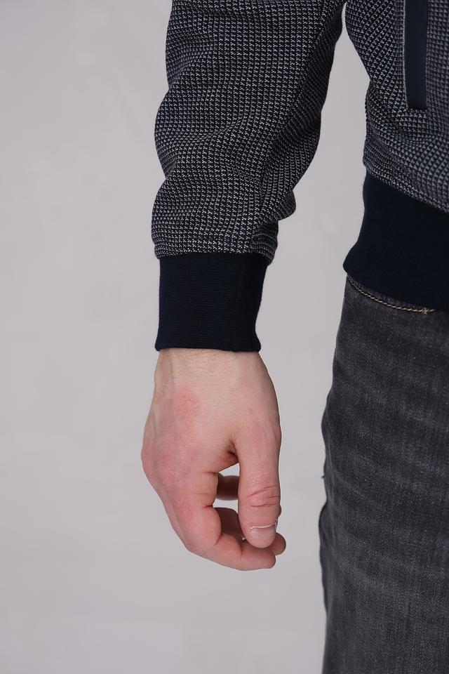 Кардиган имеет удобную застёжку-молнию, воротник-стойку с контрастной тёмно-синей отделкой, а также манжеты и нижний край из эластичной ткани тёмно-синего цвета. Сочетание полиэстера (55%) и хлопка (45%) обеспечивает комфорт в носке, практичность и долговечность изделия.