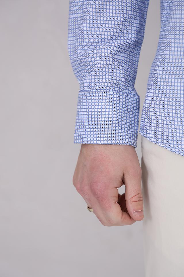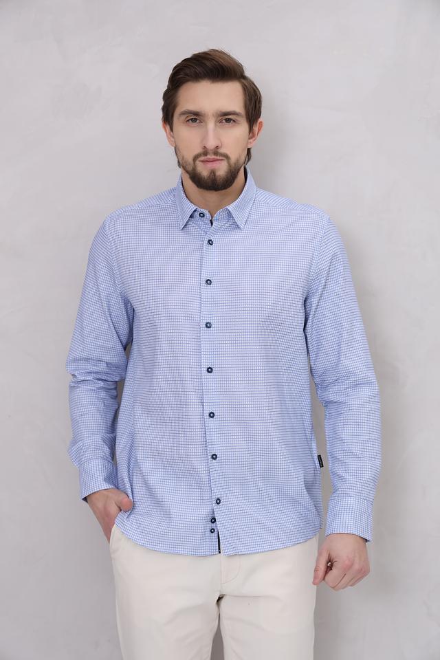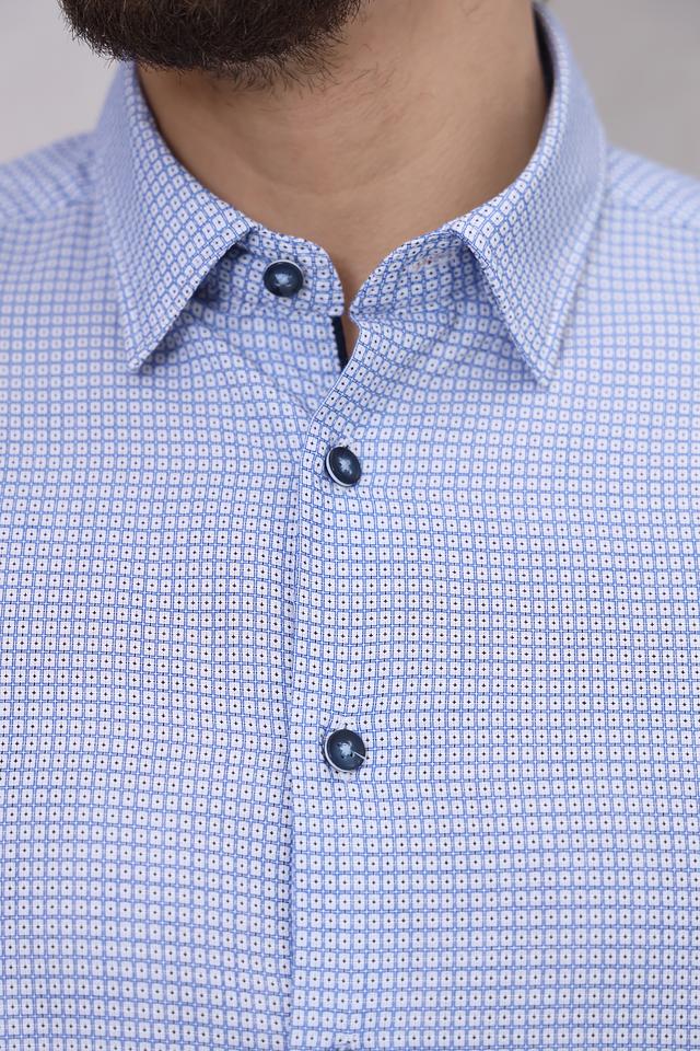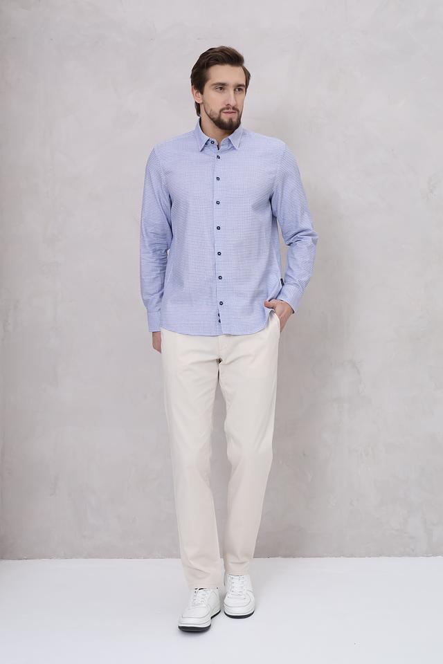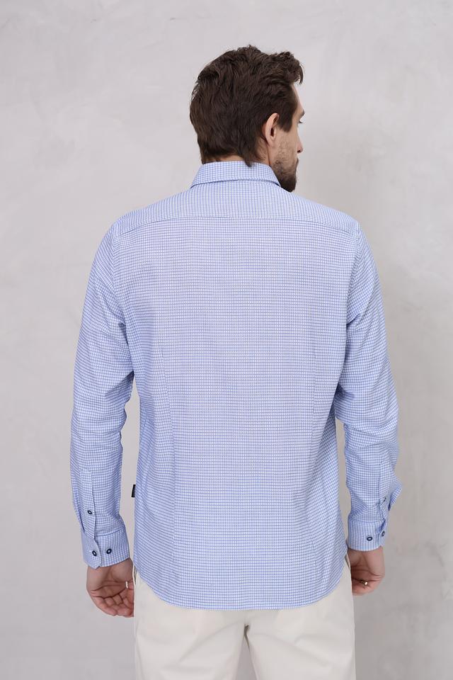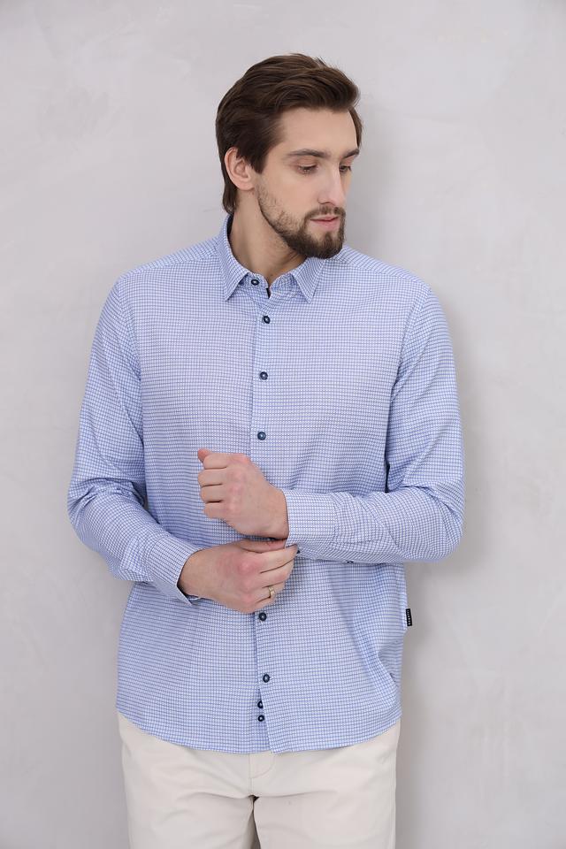 Рубашка имеет классический крой, который подходит для большинства типов фигур. Голубой цвет с мелким рисунком в клетку делает ее универсальной и легко сочетаемой с различными элементами гардероба.