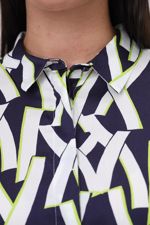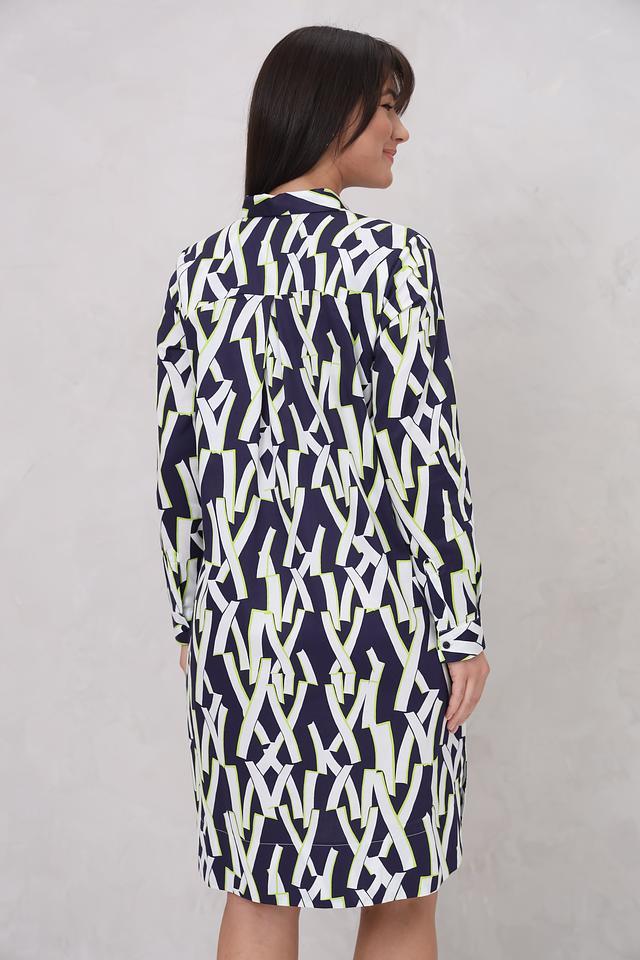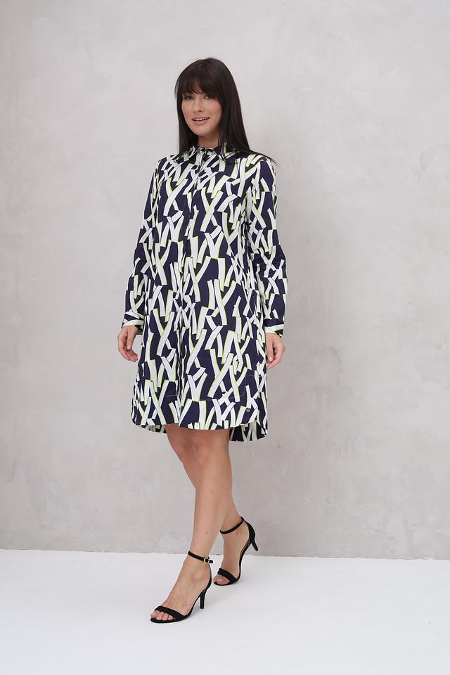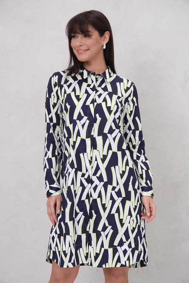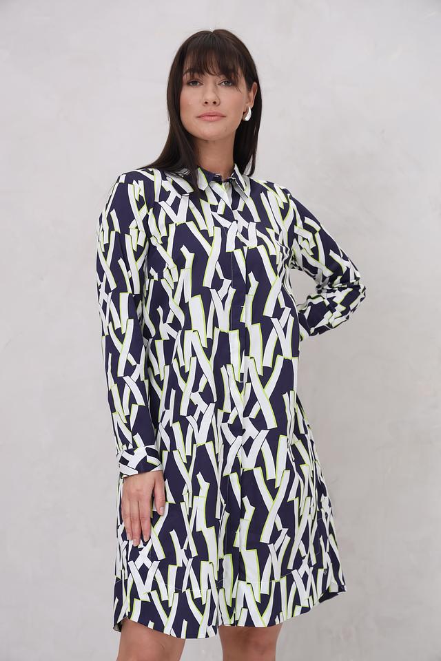 Дизайн платья представлен в виде яркого геометрического принта, сочетающего в себе оттенки синего, белого и лайма. Силуэт платья слегка приталенный, с отложным воротником и длинными рукавами. Застежка отсутствует, платье надевается через голову.