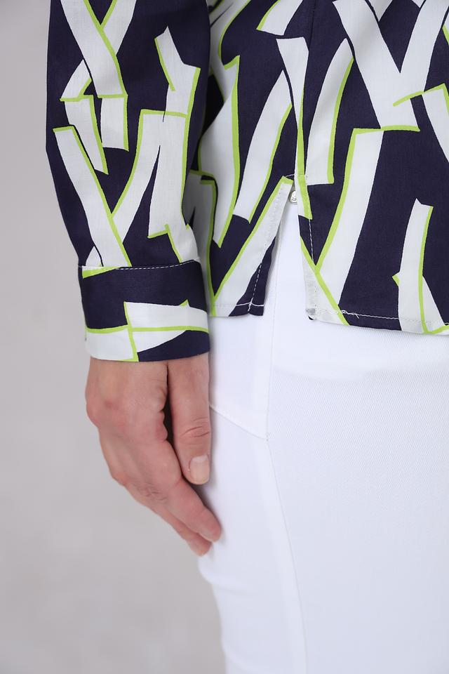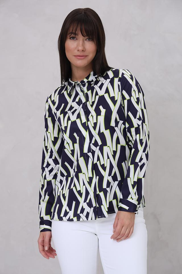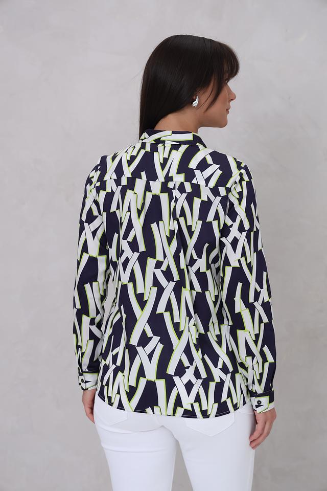 Рубашка имеет длинный рукав и классический крой, который подходит для различных типов фигур. Особенностью модели является яркий геометрический принт, сочетающий в себе оттенки синего, белого и лайма. Принт придает рубашке современный и динамичный вид.