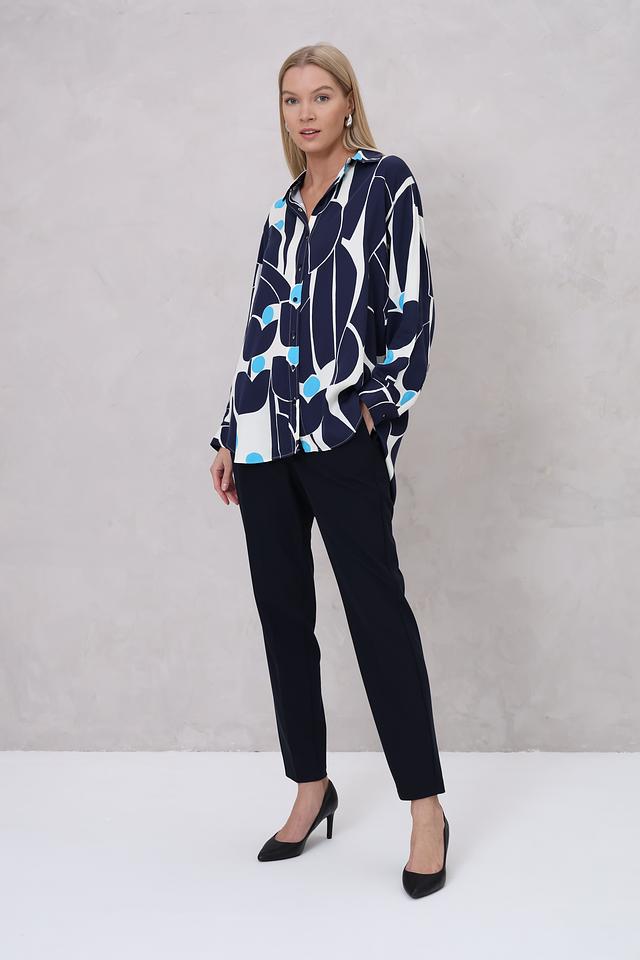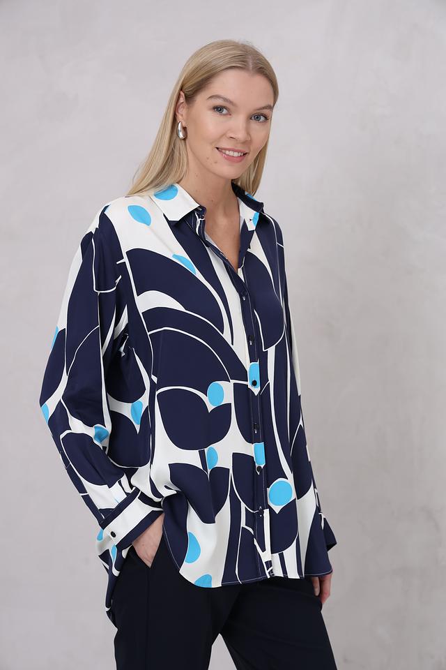 Женская рубашка Bugatti синего цвета с оригинальным геометрическим принтом. Модель выполнена из мягкой вискозы, имеет классический крой с длинными рукавами и застежкой на пуговицы. Состав: вискоза 100%