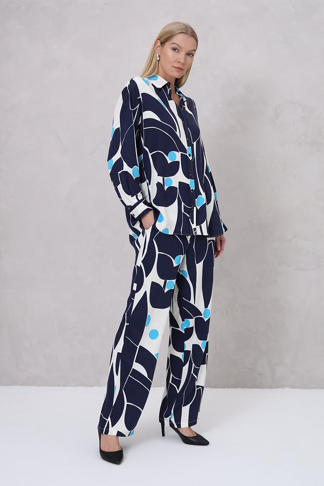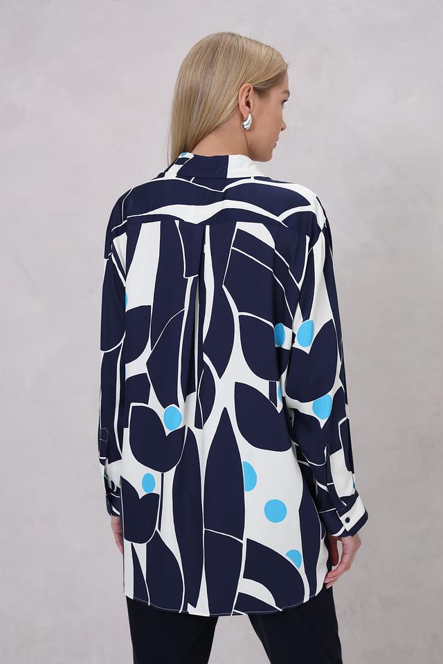 Рубашка имеет свободный крой, длинные рукава и классический отложной воротник. Застежка на пуговицы позволяет регулировать степень прилегания. Особенностью модели является яркий и необычный принт, сочетающий в себе оттенки синего, белого и голубого.