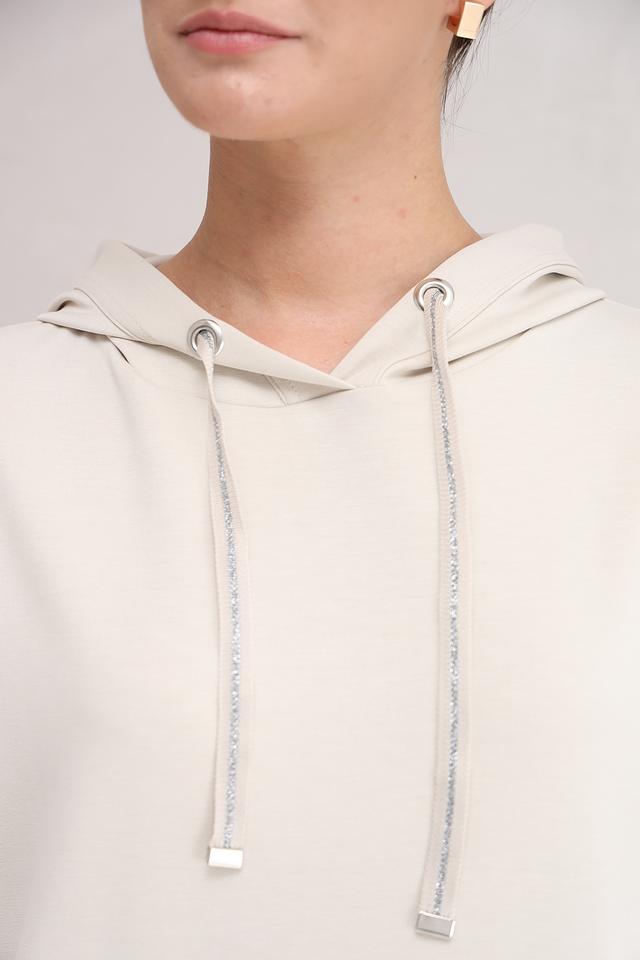 Бежевый пуловер Bugatti с короткими рукавами и капюшоном на шнурках – стильное и комфортное решение для повседневного образа. Модель выполнена из мягкого и приятного к телу трикотажа, обеспечивающего удобную посадку. Состав: модал 65%, полиэстер 30%, эластан 5%
