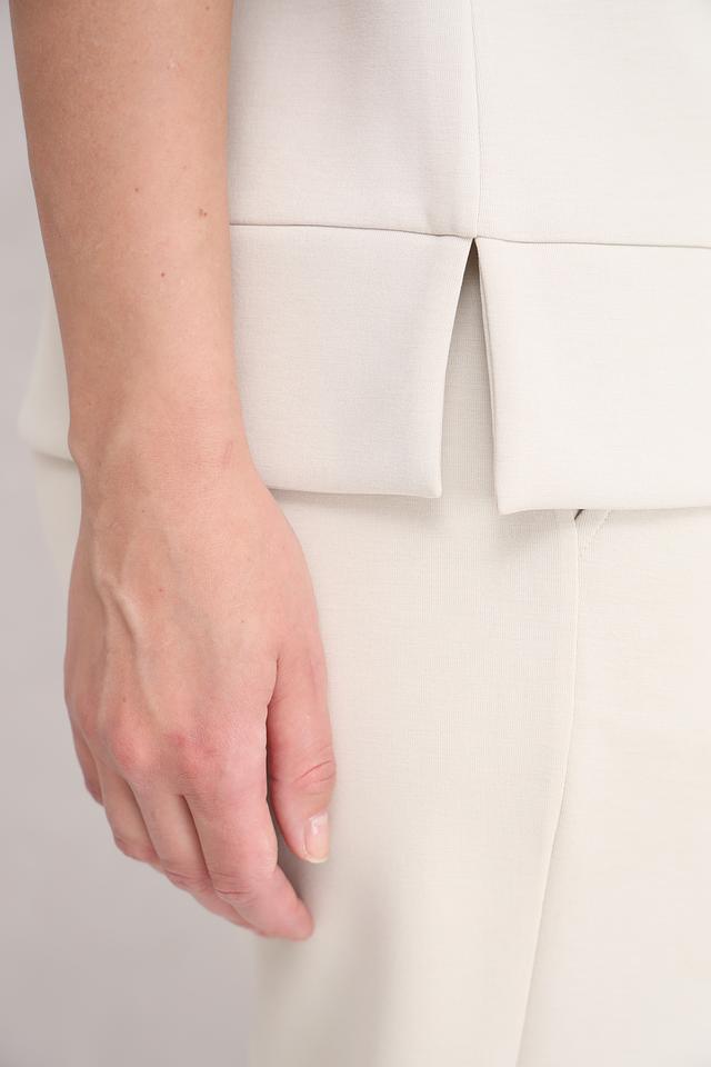 Пуловер выполнен из высококачественного трикотажа, в составе которого модал, полиэстер и эластан. Модал придает ткани мягкость и приятные тактильные ощущения, полиэстер обеспечивает форму и износостойкость, а эластан – эластичность и свободу движений.