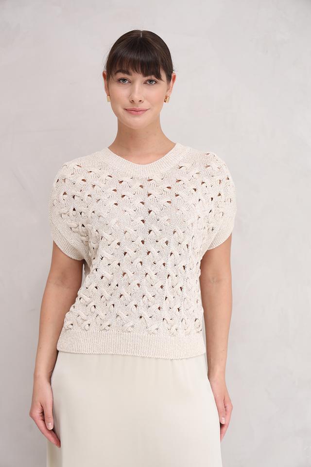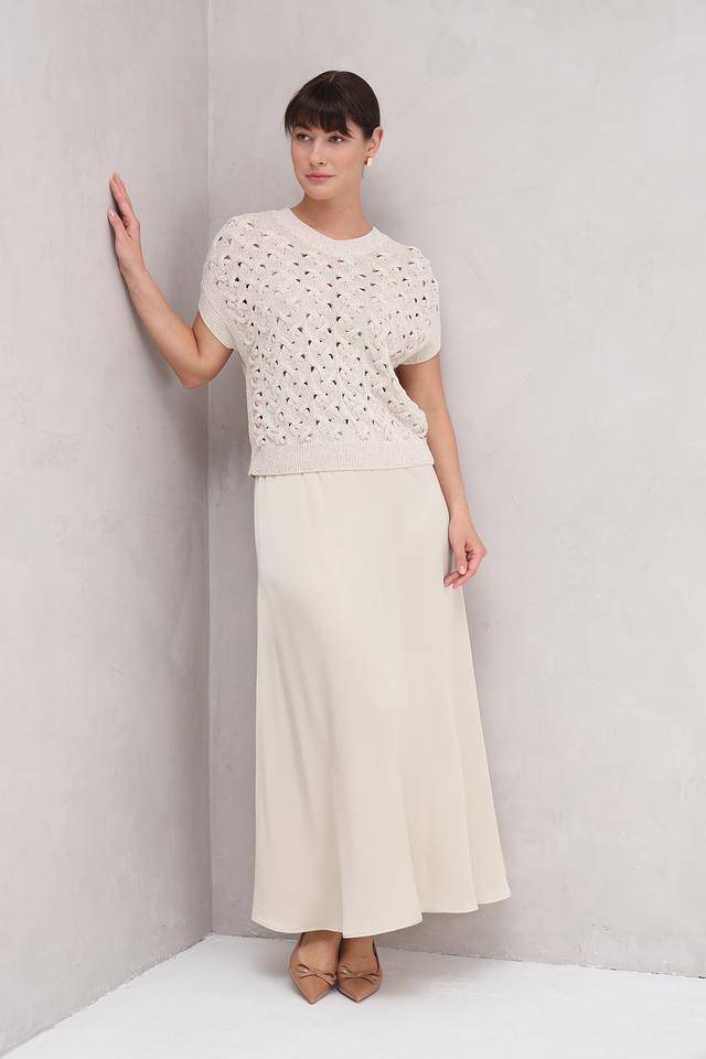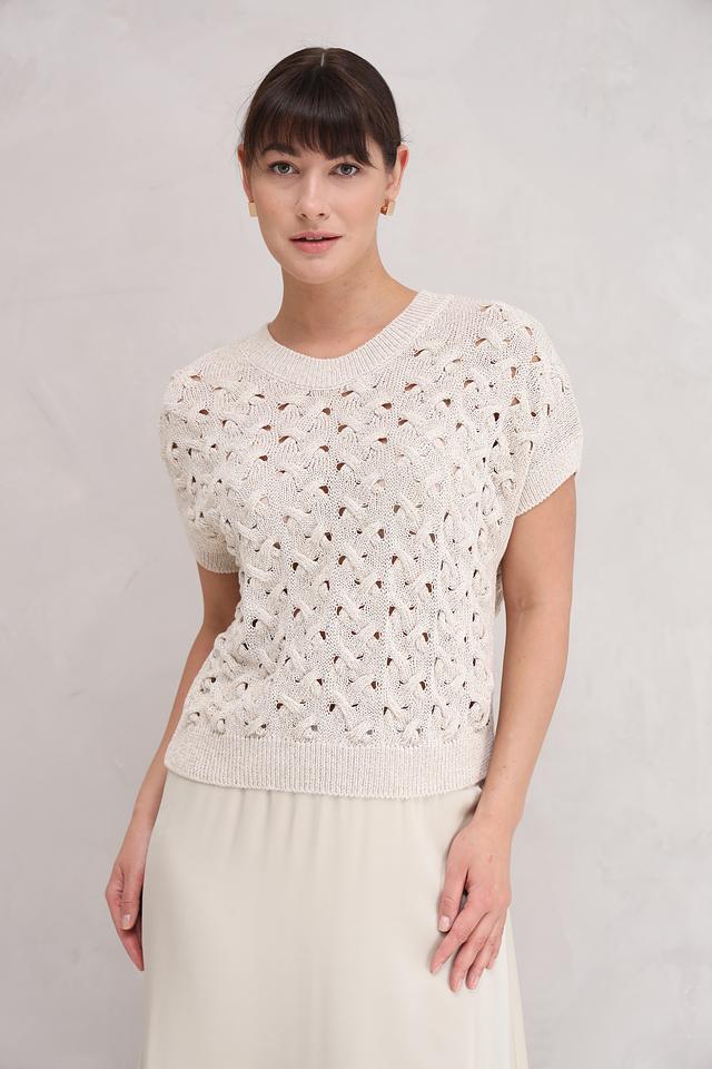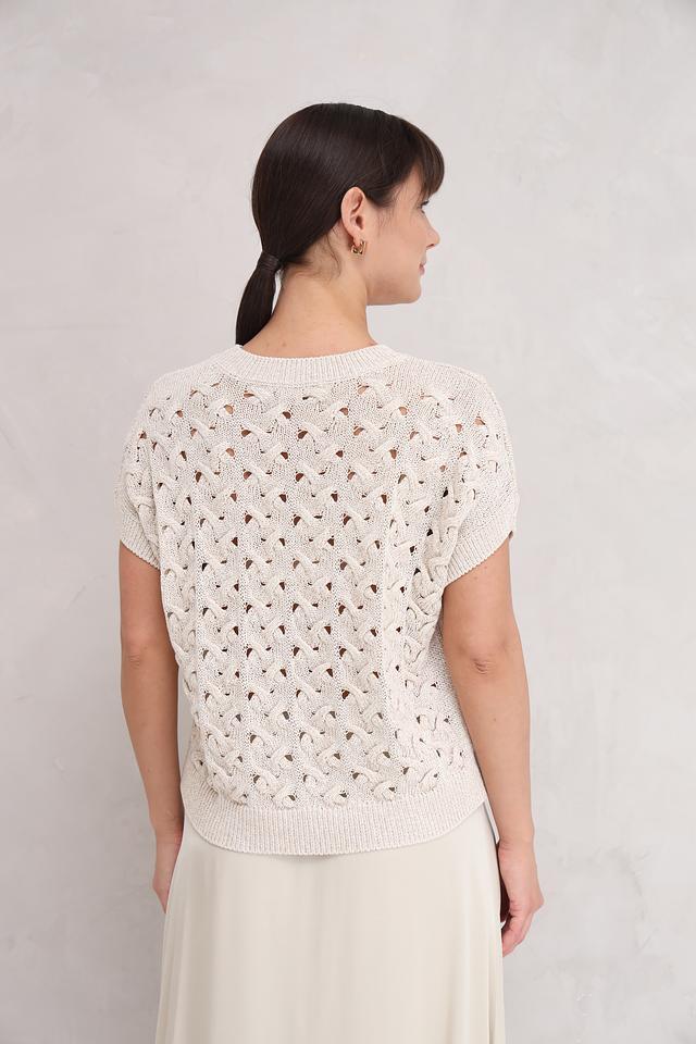 Жилет имеет удобный крой и круглый вырез горловины. Ажурная вязка придает изделию изысканность и воздушность, делая его идеальным для создания многослойных образов.