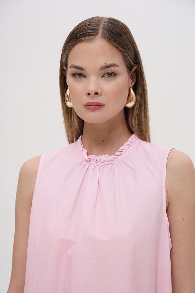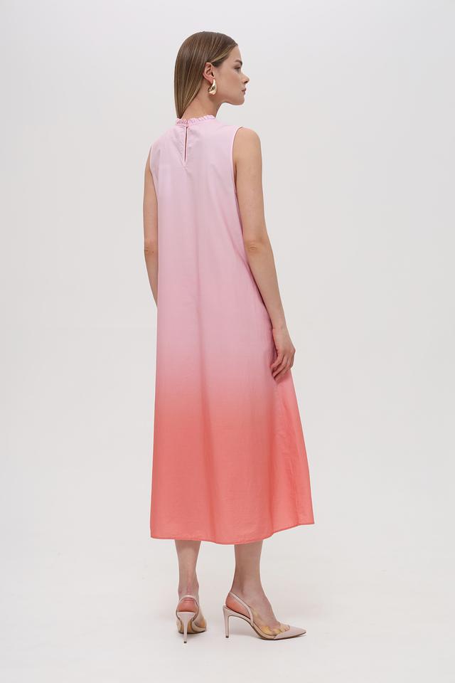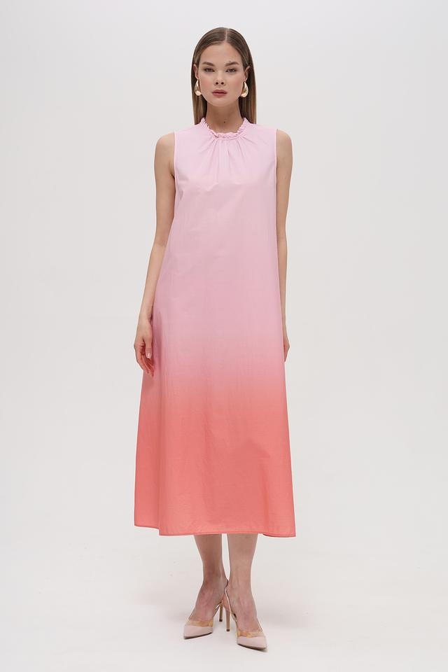 Платье имеет прямой, слегка свободный крой, который не сковывает движений. Особое внимание привлекает градиентный переход цвета от нежно-розового в верхней части к персиковому в нижней. Вырез горловины оформлен небольшим воланом, добавляющим образу женственности.