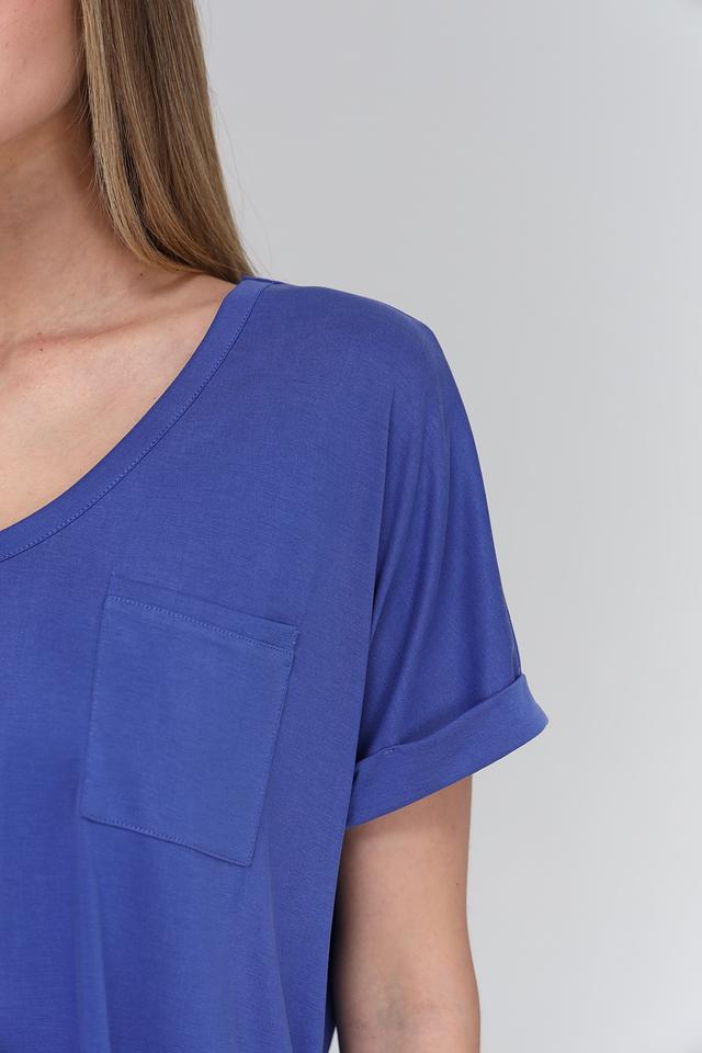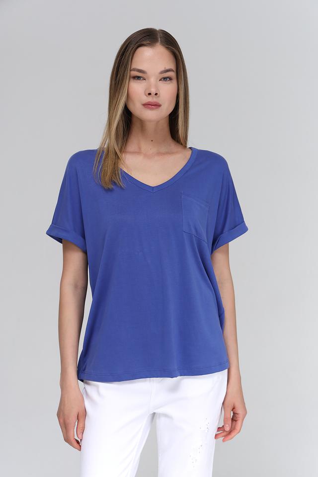 Футболка имеет V-образный вырез горловины, который визуально удлиняет шею и делает образ более женственным. Короткие рукава с небольшим подворотом придают футболке непринужденный и современный вид. На груди расположена накладная карман, который добавляет функциональности и оригинальности.