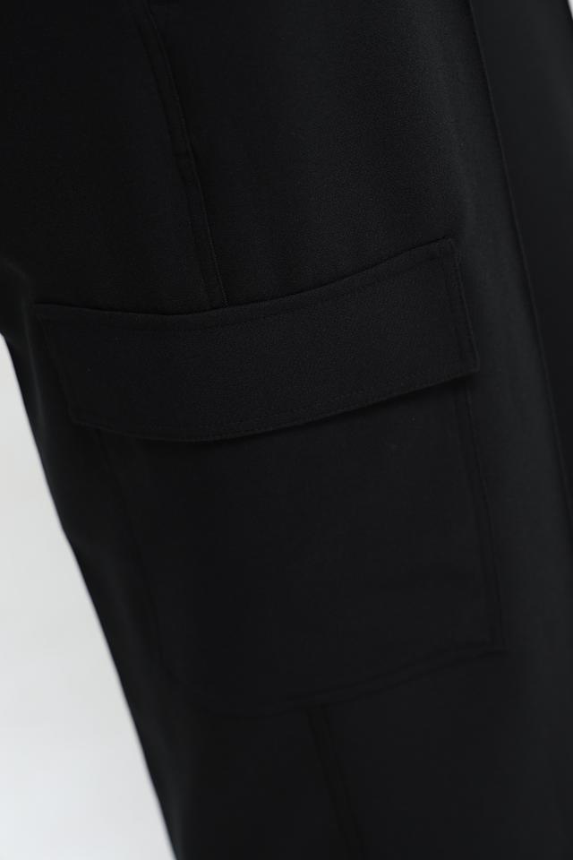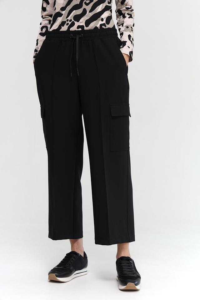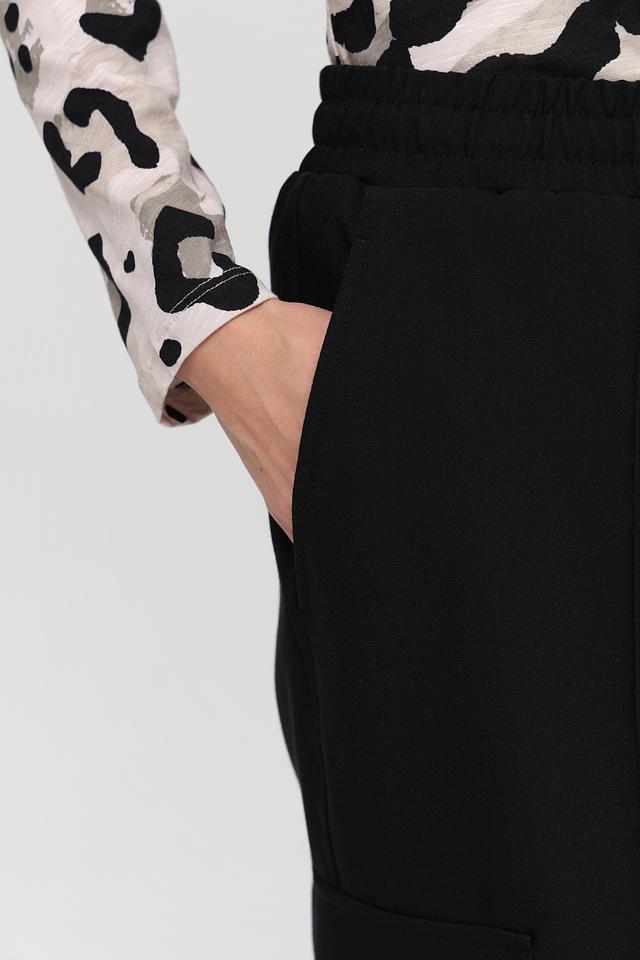 Брюки имеют прямой крой и стандартную посадку по фигуре. Отличительной особенностью являются функциональные боковые карманы-патрубки, добавляющие образу динамичности. Застежка на молнию и пуговицу, а также эластичный пояс с кулиской обеспечивают удобную и надежную фиксацию.