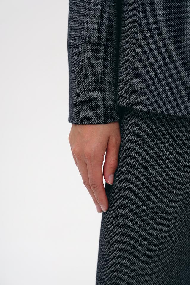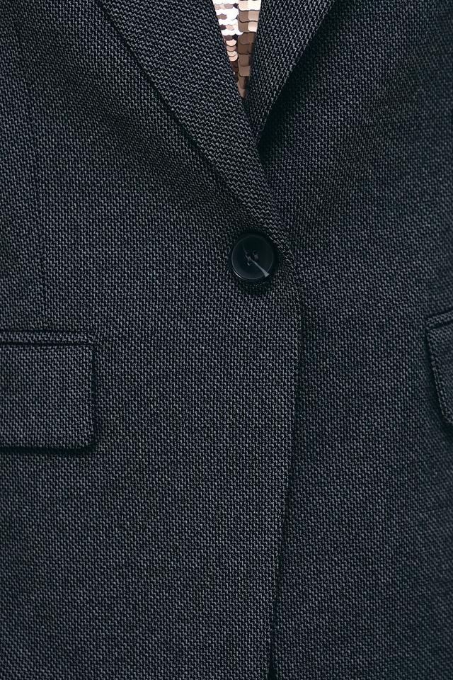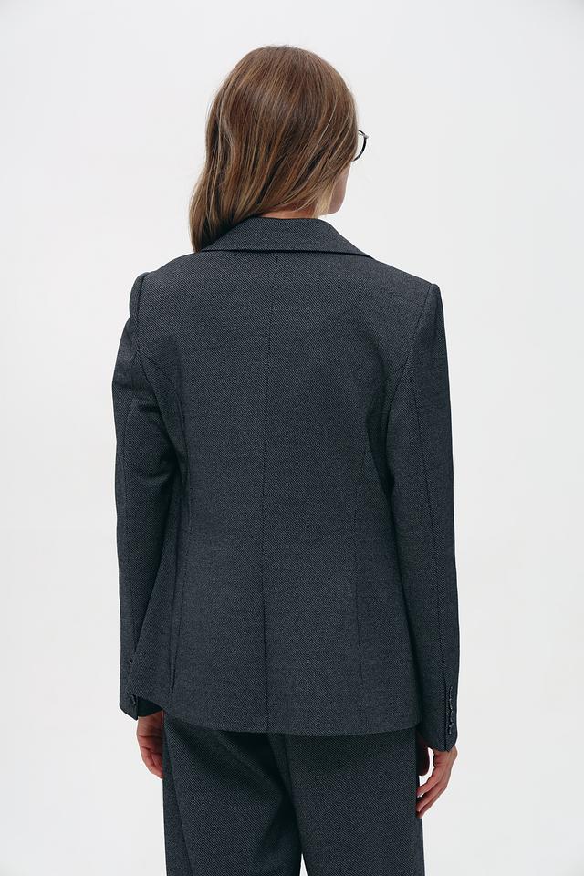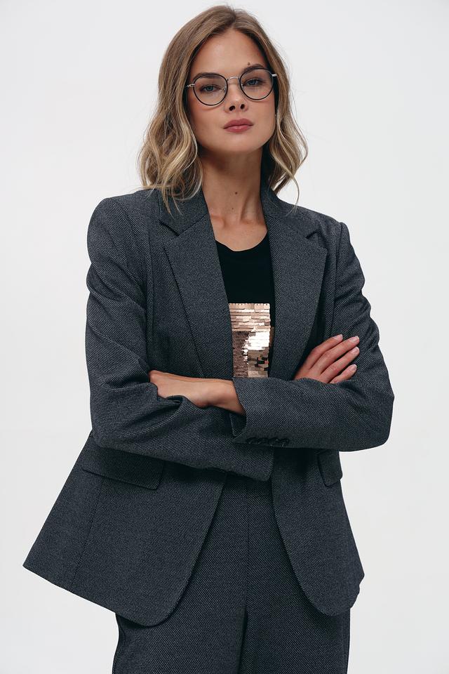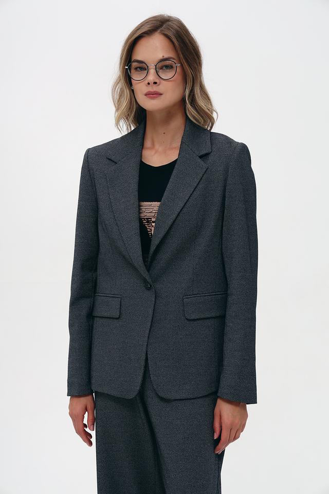 Жакет имеет классический крой с лацканами, однобортную застежку на пуговицу и функциональные карманы. Состав ткани включает полиэстер, хлопок и эластан, что обеспечивает приятные тактильные ощущения, хорошую посадку по фигуре и устойчивость к сминанию.