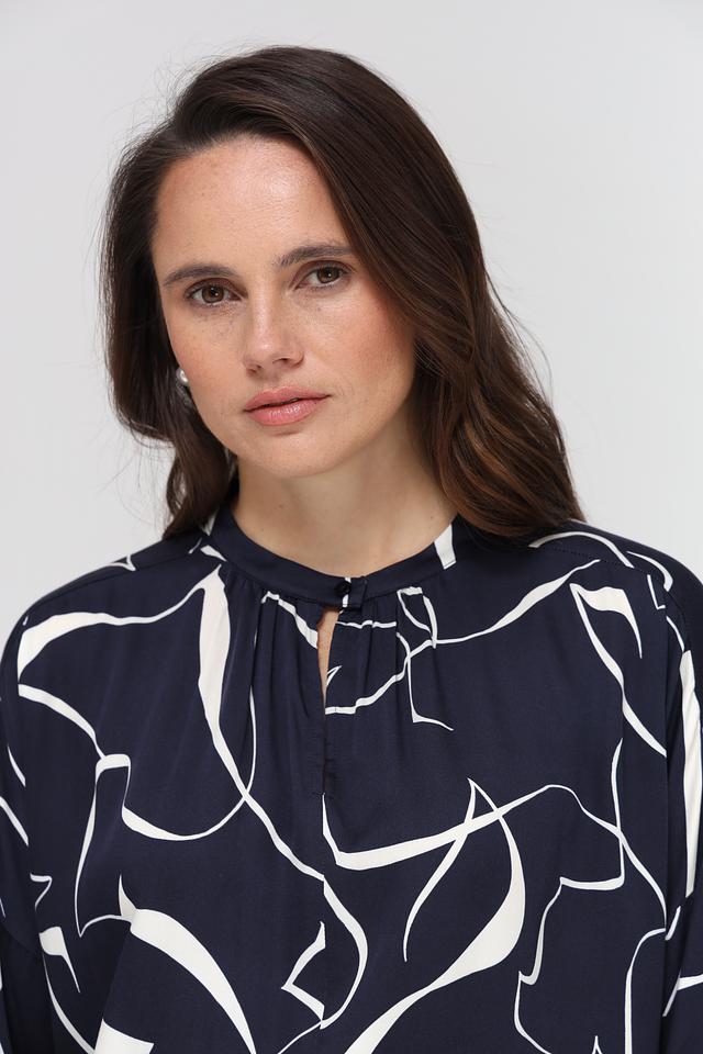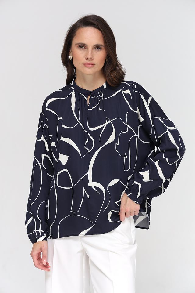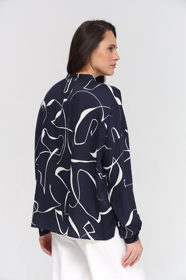 Блуза имеет свободный крой, который не сковывает движения, и рукава-фонарики, придающие образу романтичность и легкость. Особенностью модели является оригинальный абстрактный рисунок в белоснежных тонах на темно-синем фоне, который делает ее уникальной и привлекательной.