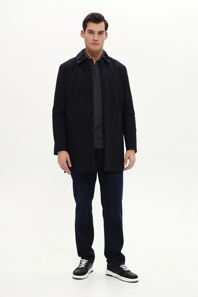 Плащ имеет прямой крой, который обеспечивает комфортную свободу движений. Застёжка на скрытые кнопки позволяет легко надевать и снимать плащ, а воротник добавляет образу изысканности.