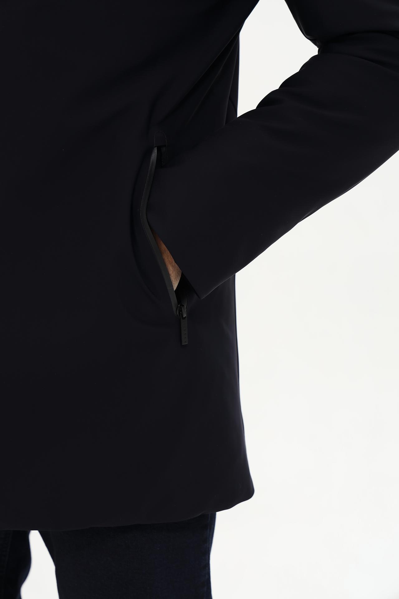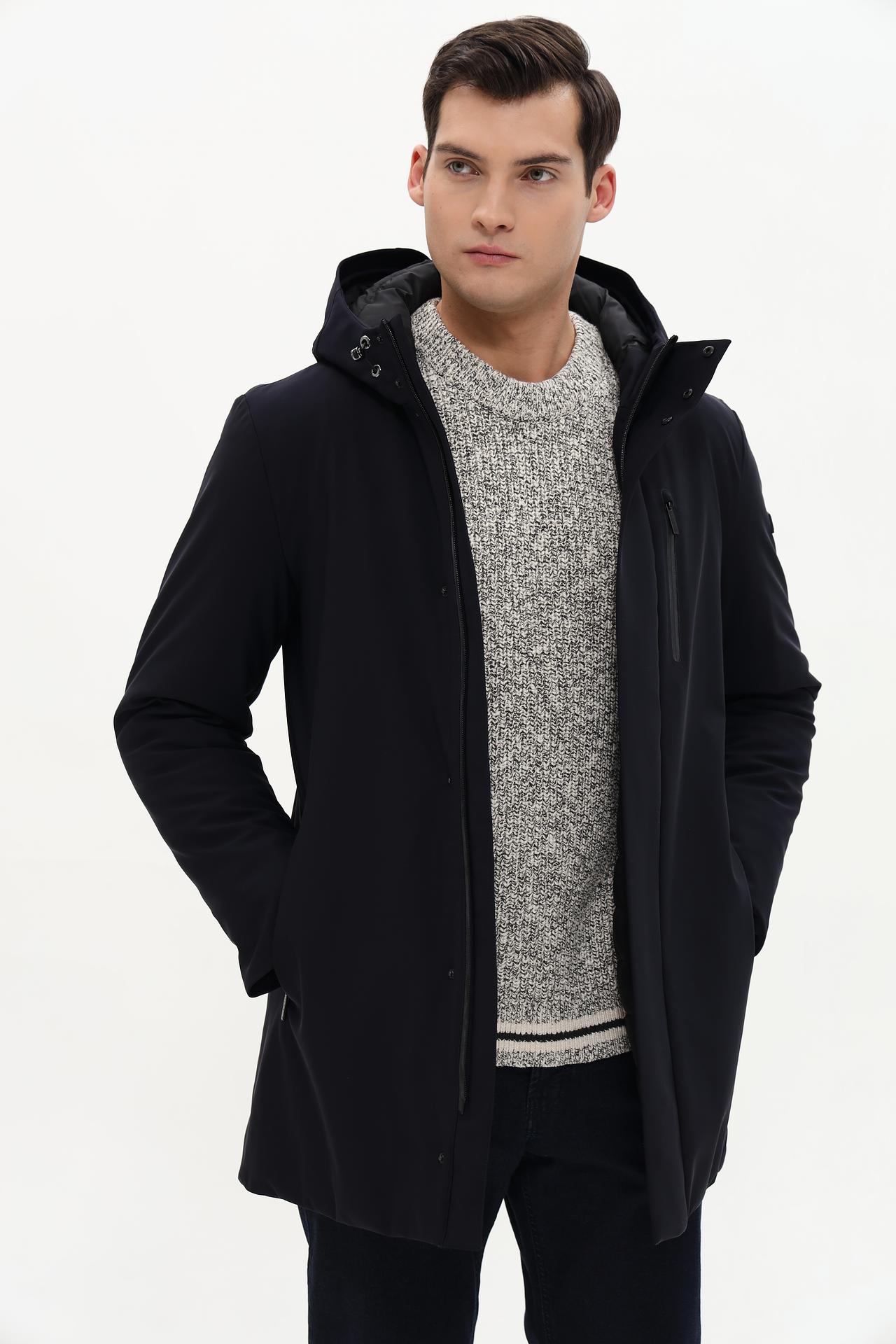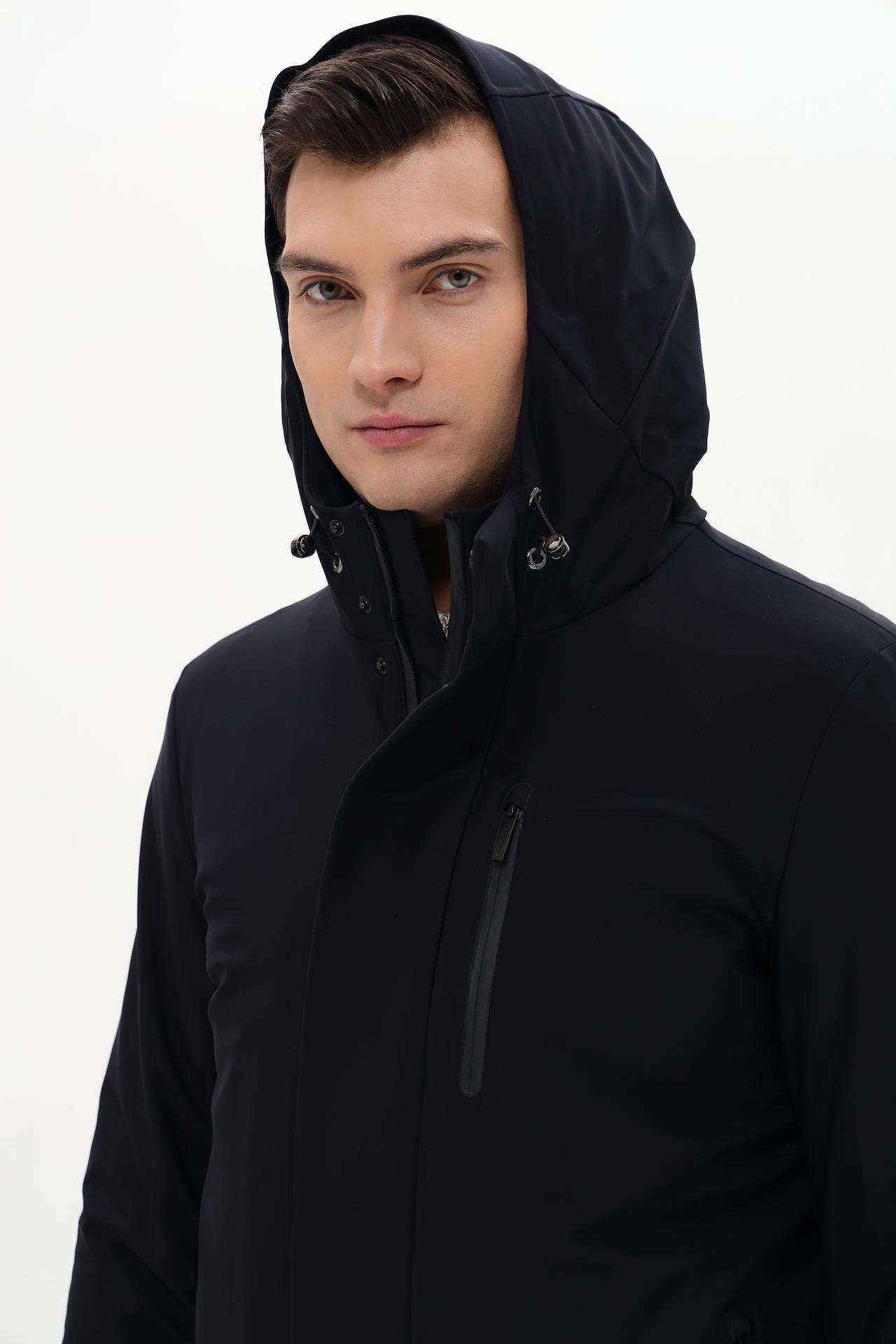 - Универсальный дизайн: Темно-синяя куртка с классическим кроем и капюшоном легко вписывается в любой образ, от делового до повседневного, делая ее незаменимой для мужского гардероба.