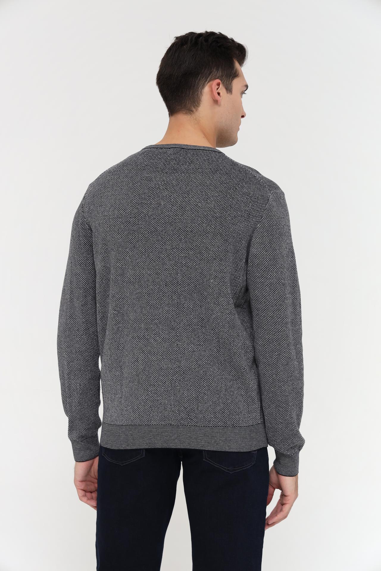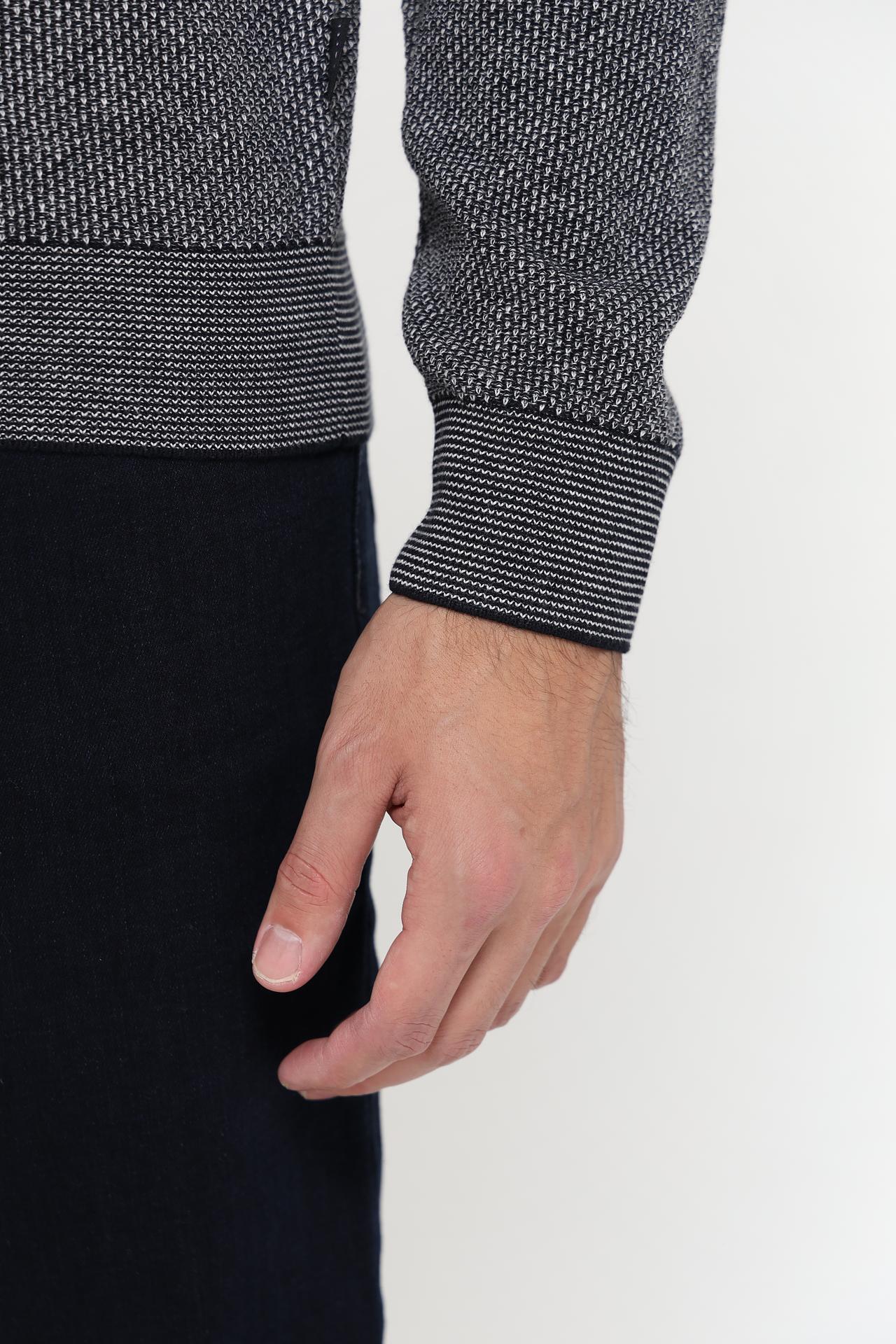 - Дизайн: Классический джемпер с круглым вырезом и длинными рукавами. Мелкий геометрический узор по всей поверхности придает изделию элегантность и универсальность. Контрастная отделка по вороту, манжетам и низу изделия добавляет стильный акцент.