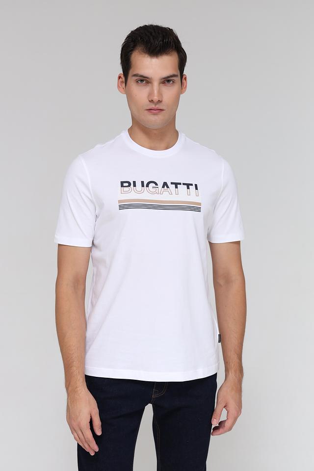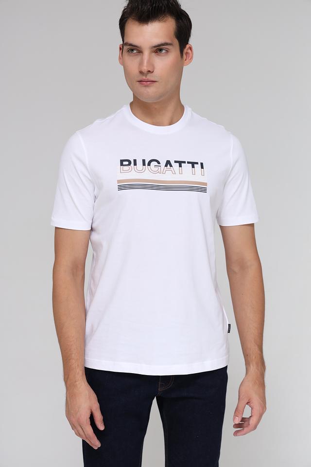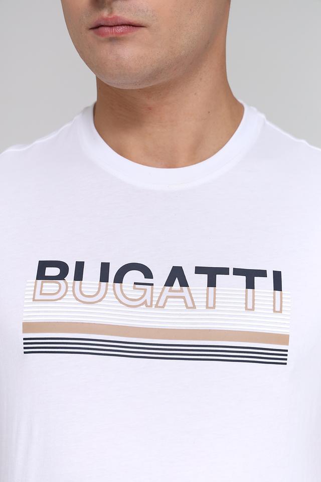 Белая футболка Bugatti с контрастным логотипом и полосками. Изготовлена из 100% хлопка, обеспечивающего комфорт и воздухопроницаемость. Идеальный выбор для повседневного образа. Состав: хлопок 100%