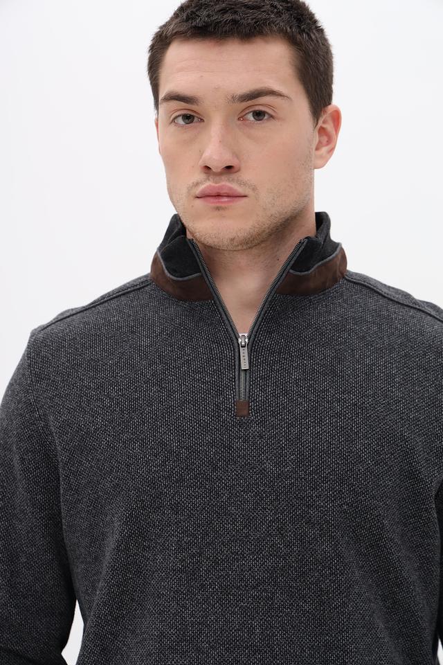 Мужской джемпер от Bugatti выполнен в сером цвете с текстурированным узором. Модель имеет воротник-стойку и короткую молнию, что придает ей современный и стильный вид.
