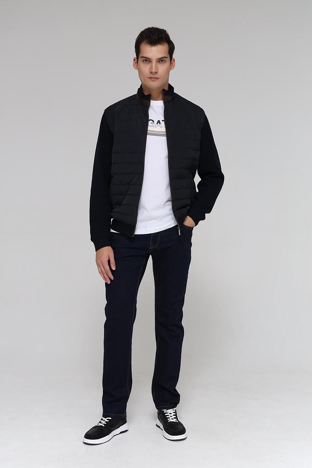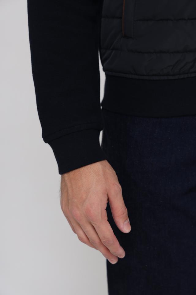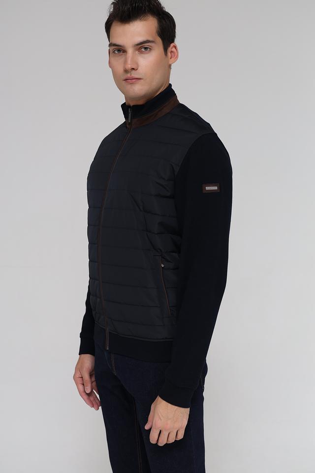 Мужской кардиган от Bugatti – это сочетание комфорта и современного дизайна. Модель выполнена в черном цвете и отличается комбинированной текстурой: гладкая вязка и стеганая планка. Застежка – молния, воротник – стойка.