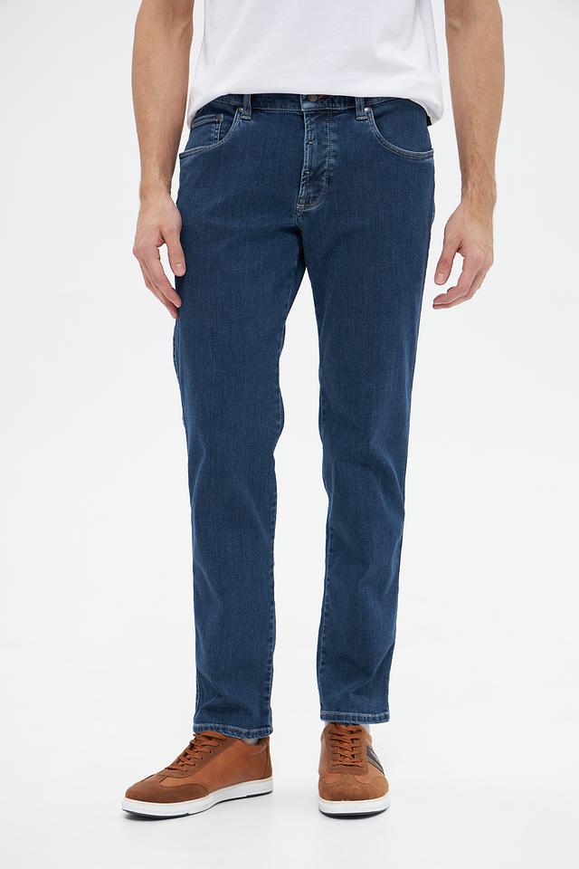На задней части джинсов расположена небольшая кожаная бирка с логотипом бренда Bugatti. Пять карманов — два передних, два задних и один небольшой карман для мелочи — добавляют функциональности. Эти джинсы станут отличным выбором для повседневной носки и создания стильных образов.