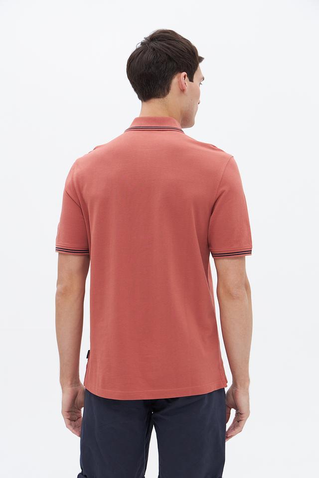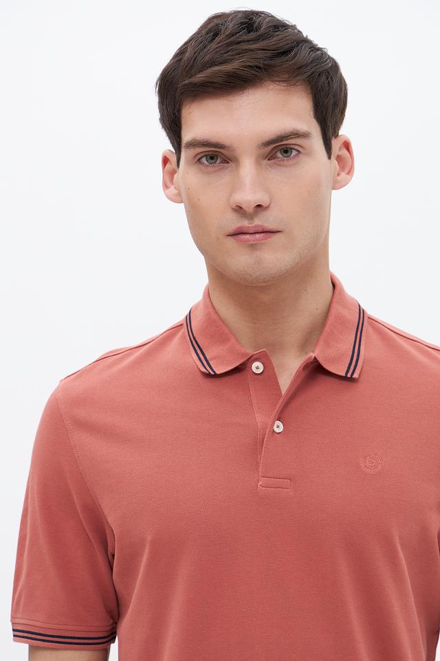 Модель имеет классический крой, короткие рукава и воротник-поло с контрастной окантовкой в тонкую полоску. Цвет поло – терракотовый, спокойный и универсальный, легко сочетается с различными элементами гардероба.