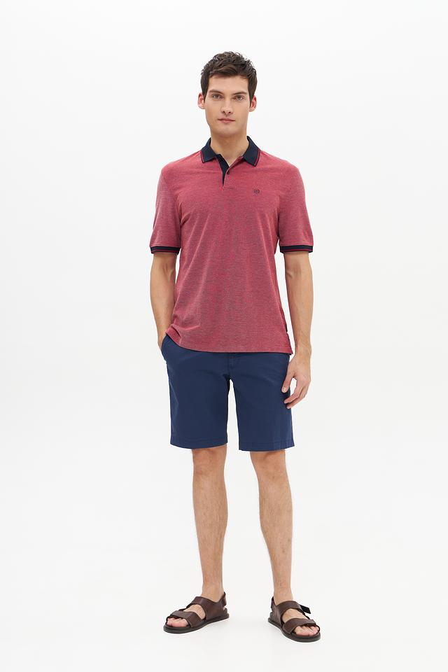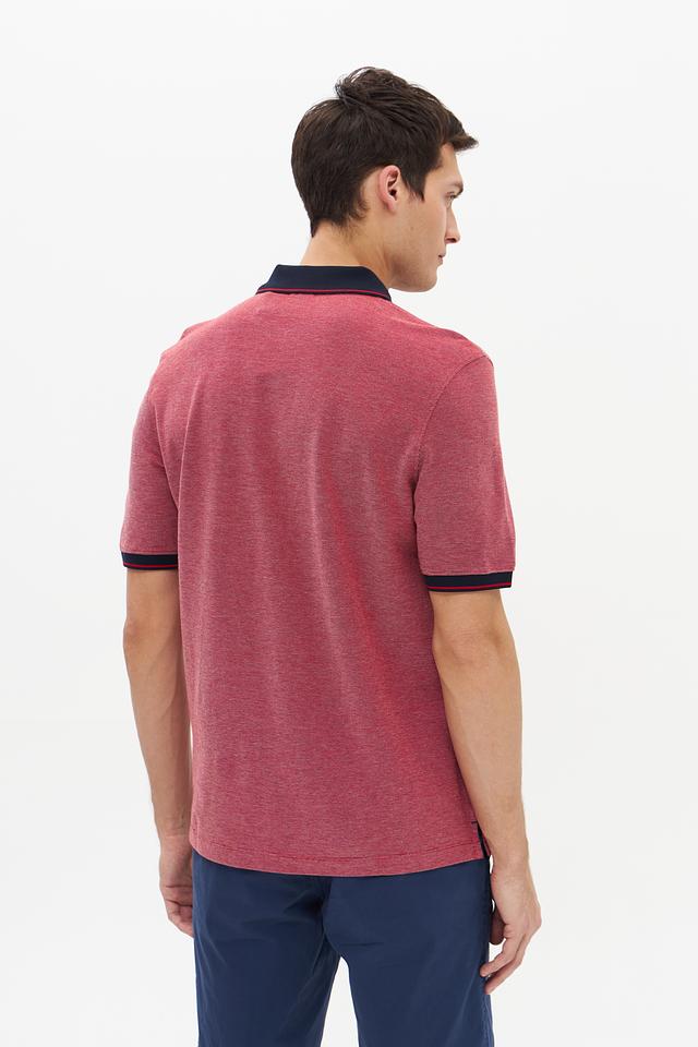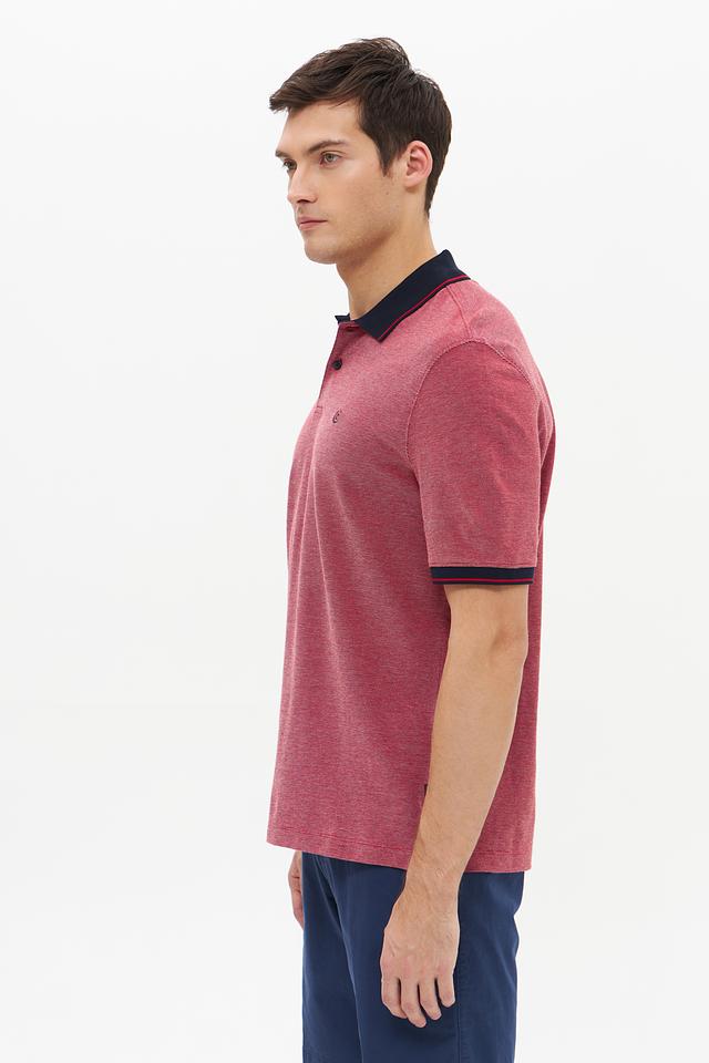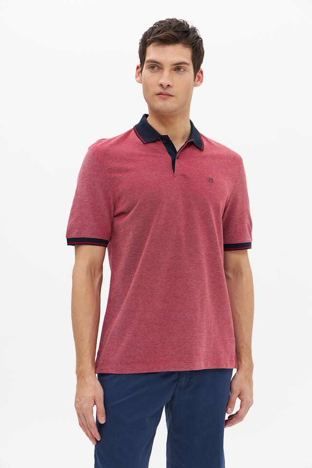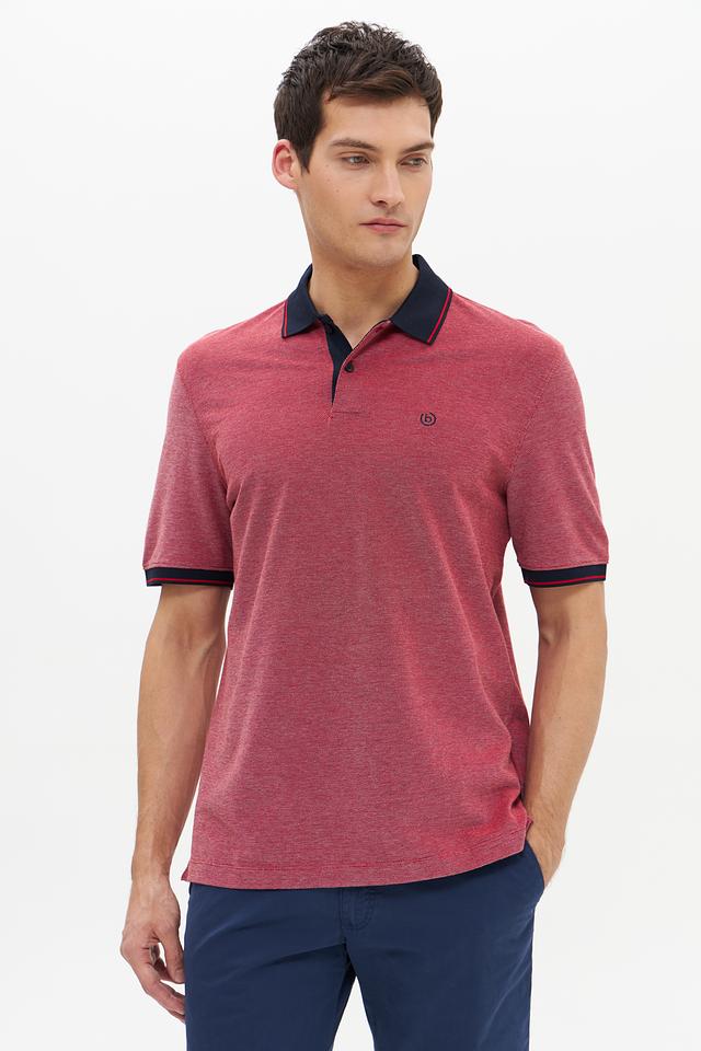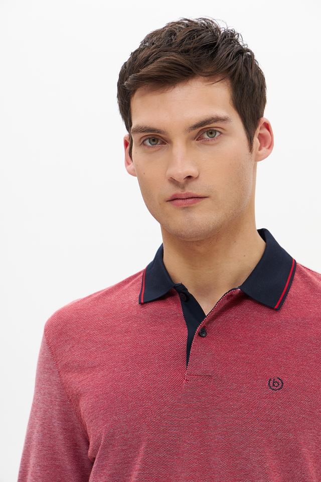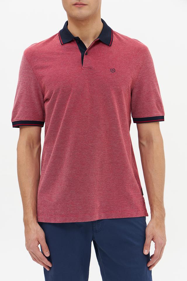 Мужское поло Bugatti винного цвета с контрастной тёмно-синей отделкой на воротнике и рукавах. Изготовлено из 100% хлопка, обеспечивающего комфорт и воздухопроницаемость. Стильное и универсальное решение для повседневного гардероба. Состав: хлопок 100%