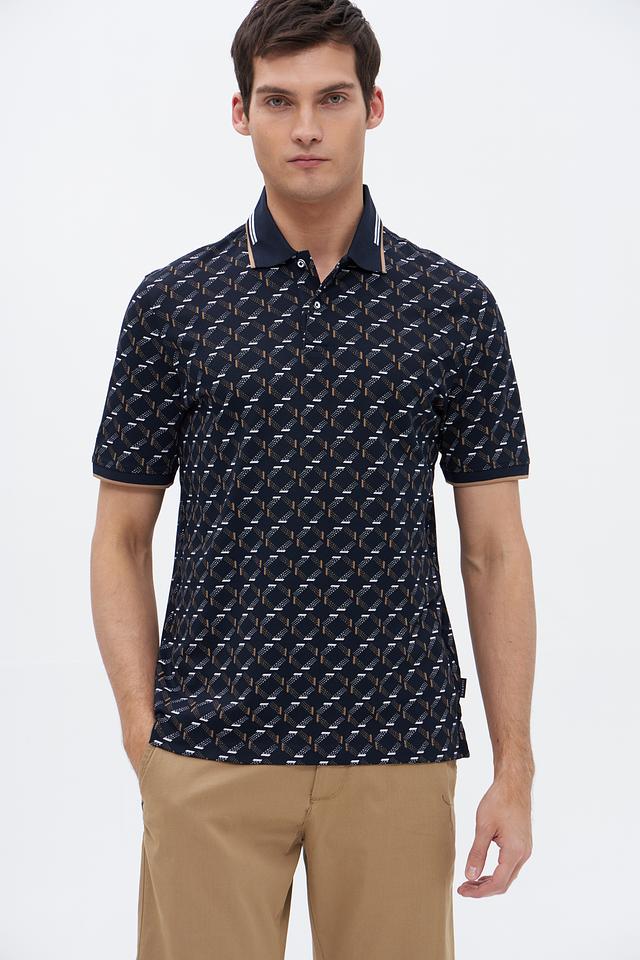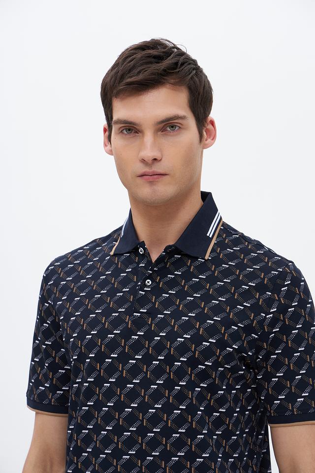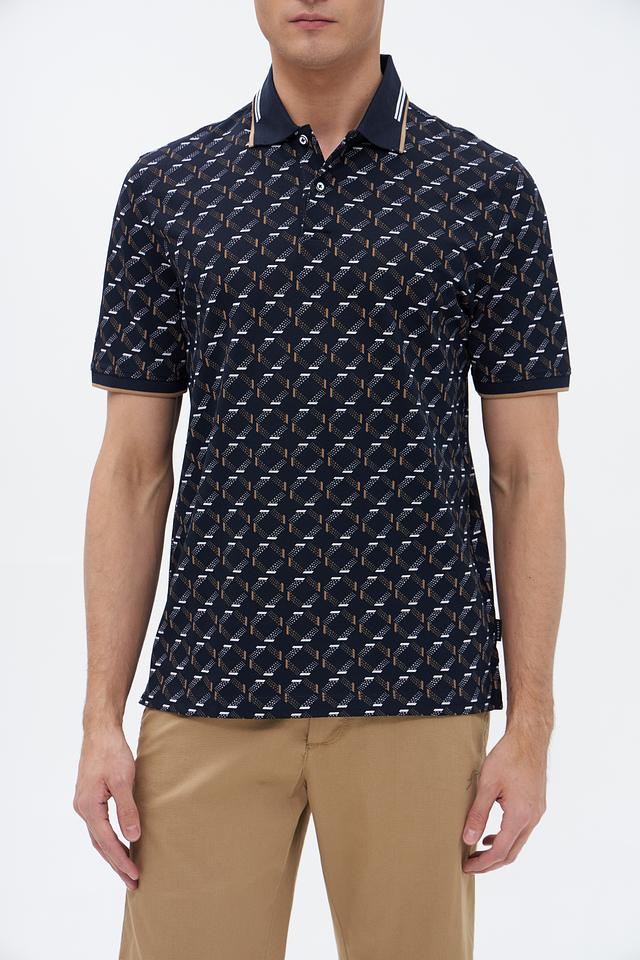 Мужское поло Bugatti тёмно-синего цвета с оригинальным геометрическим принтом. Изготовлено из высококачественного хлопка с добавлением полиэстера и эластана для комфорта и долговечности. Состав: хлопок 52%, полиэстер 44%, эластан 4%