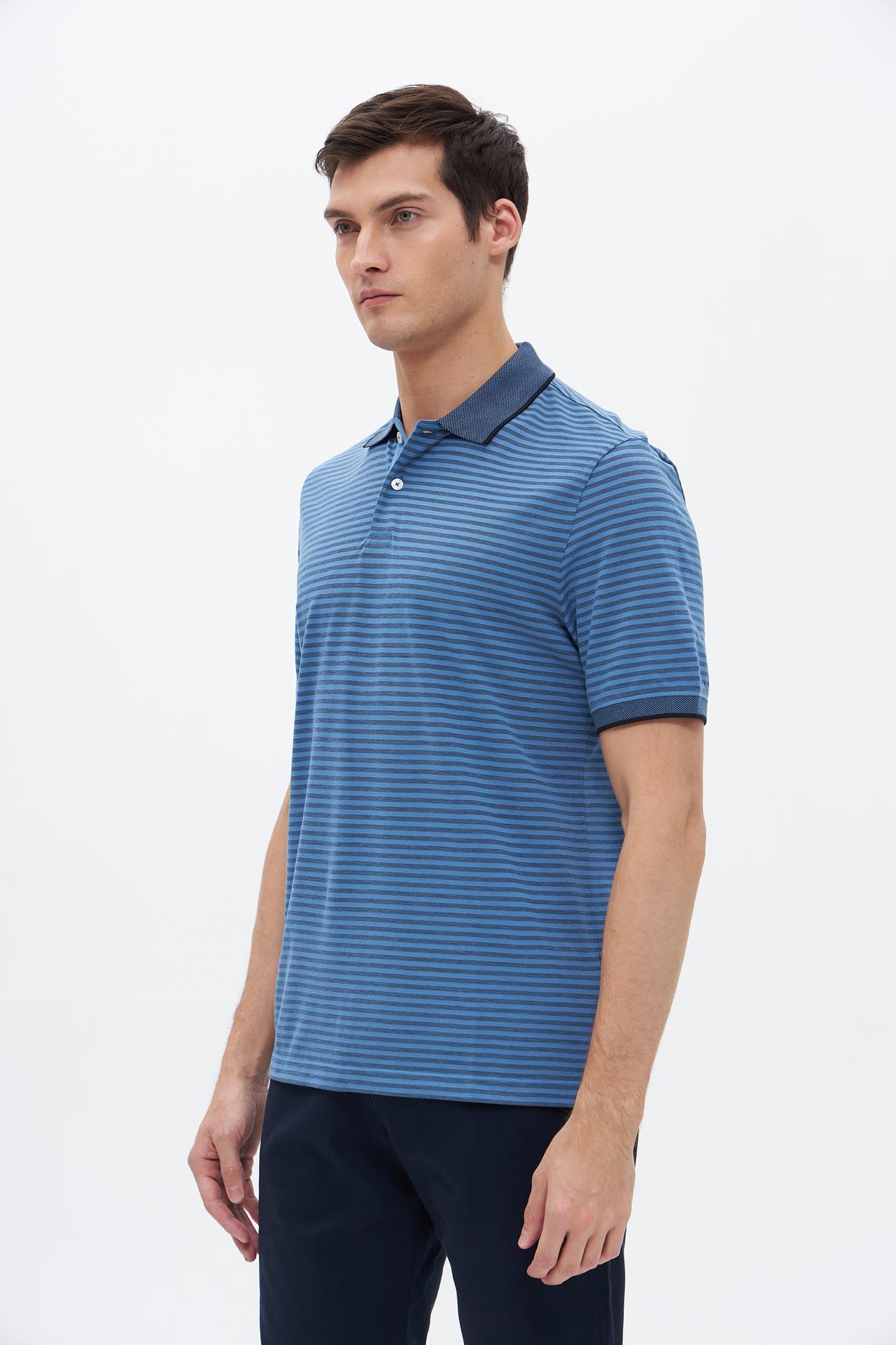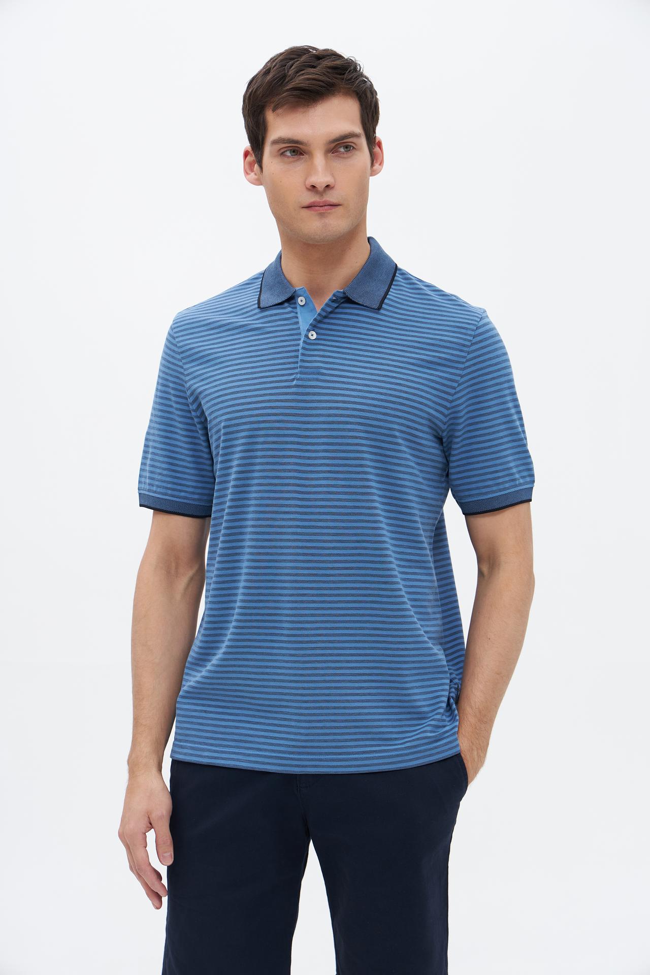 - Универсальный дизайн. Полосатый принт в оттенках голубого и синего легко сочетается с различными элементами гардероба. Эта мужская футболка поло подойдет как для расслабленного casual стиля, так и для более строгих образов.