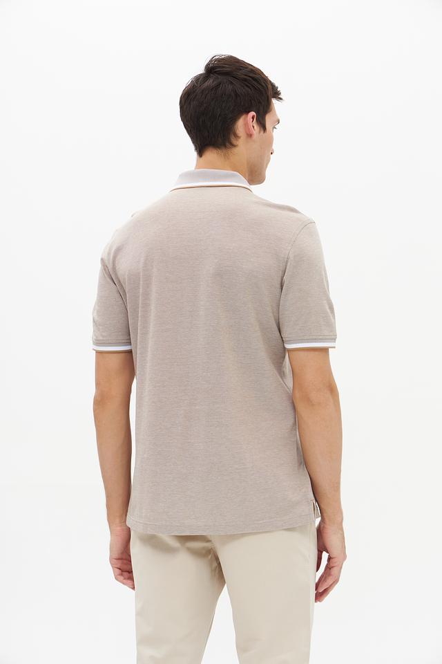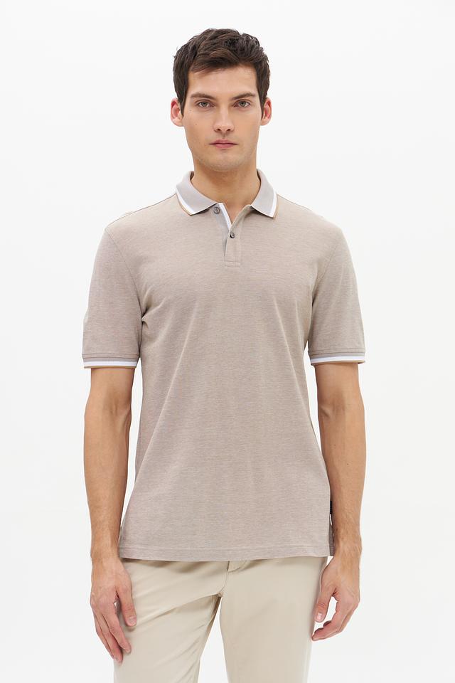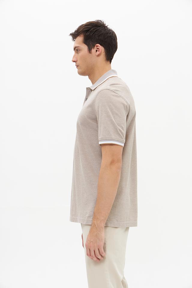 Модель имеет классический крой, подходящий для различных типов фигуры. Бежевый цвет поло дополнен контрастной отделкой на воротнике и коротких рукавах, что придает изделию стильный и современный вид.