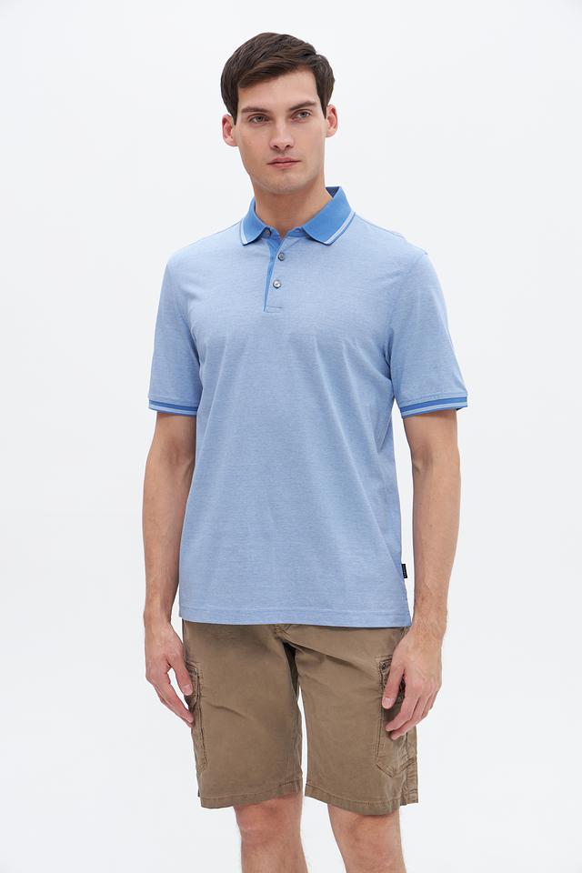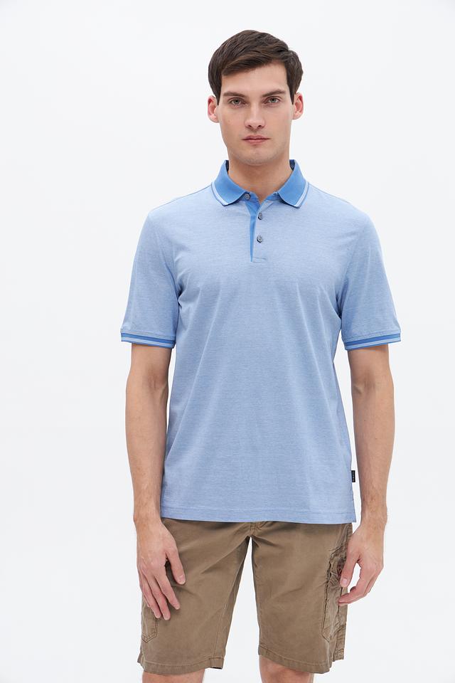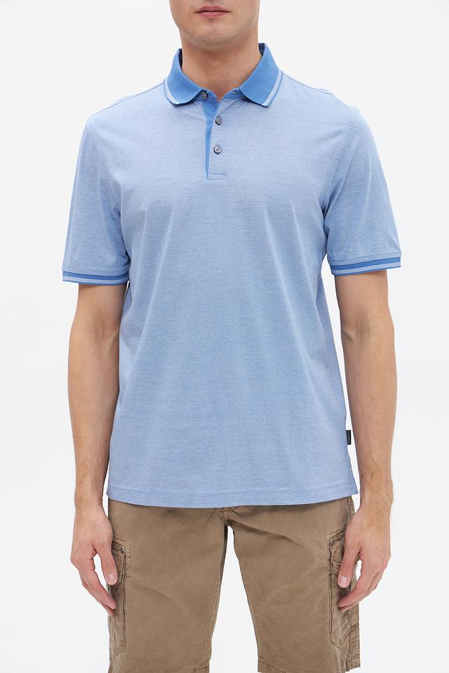 Мужское поло Bugatti голубого цвета с контрастной полоской на воротнике и рукавах. Изготовлено из 100% хлопка, обеспечивающего комфорт и воздухопроницаемость. Состав: хлопок 100%
