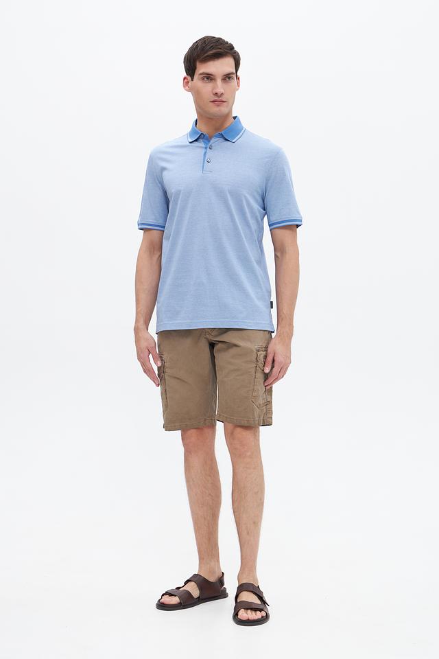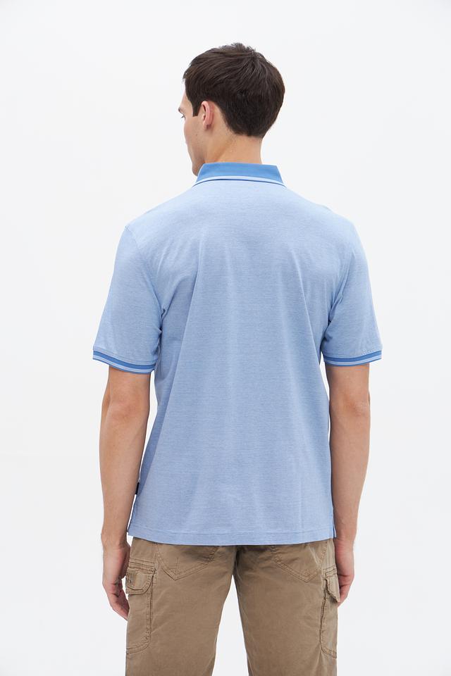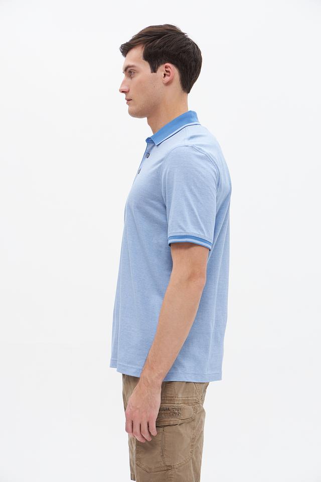 Дизайн поло отличается лаконичностью и элегантностью. Голубой цвет полосатой отделки на воротнике и рукавах добавляет динамики и индивидуальности образу. Классический крой поло обеспечивает свободу движений и подходит для различных типов фигур.